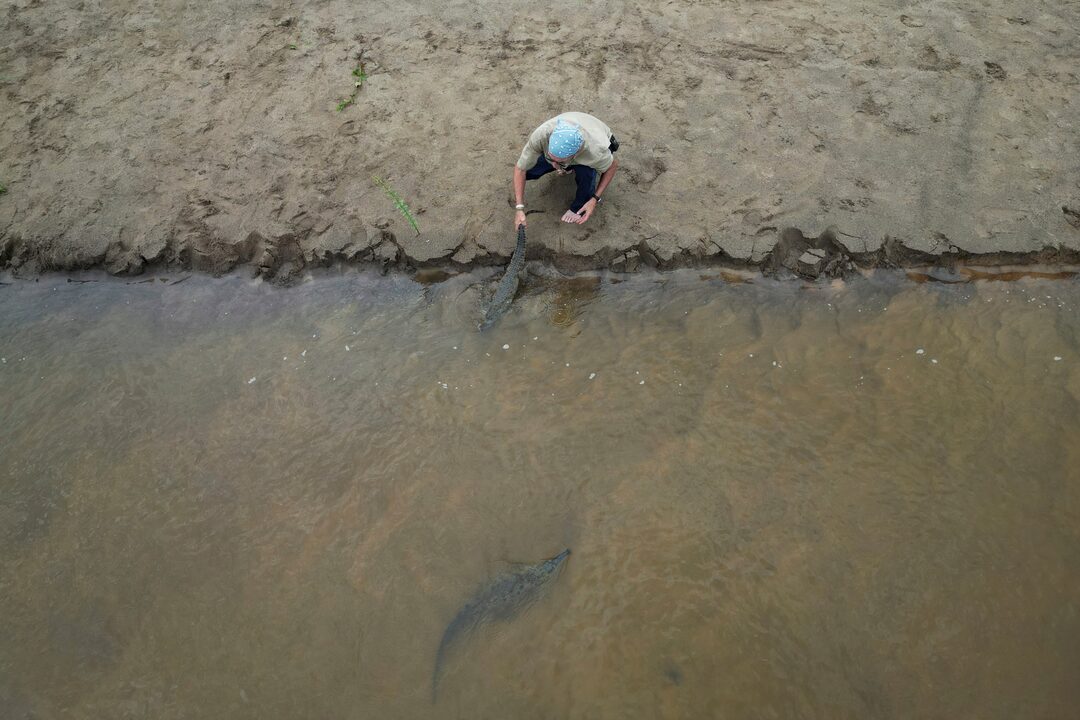 卡車載着科學家、鱷魚和志願者們穿過泥濘的道路,來到河邊的一個營地,人們在那裏吊牀上過夜。第二天,他們小心翼翼地將鱷魚從籠子裏取出,帶到河邊。幼年鱷魚滑入渾濁泛綠的河水中。