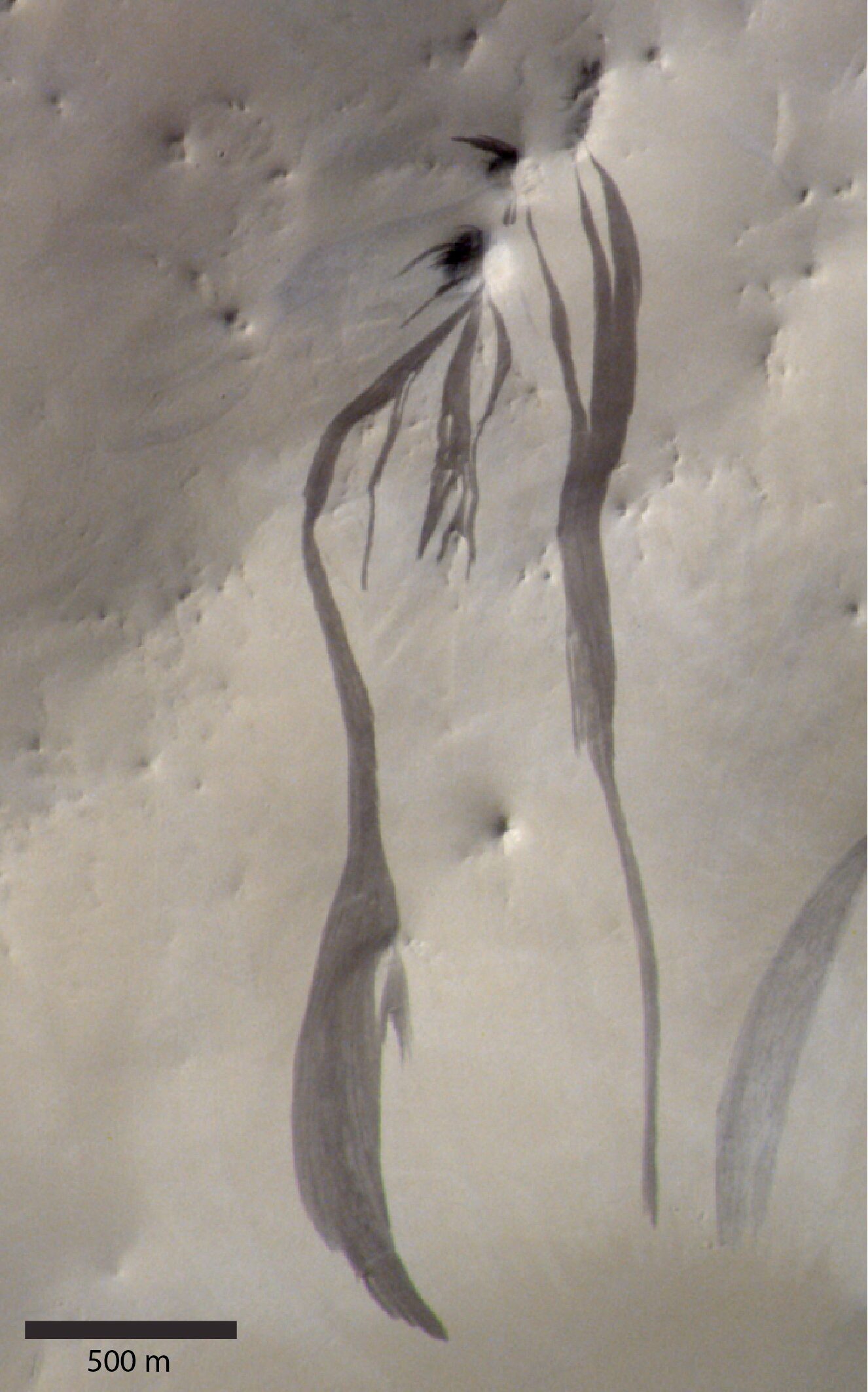 該研究檢查了大約87,000張衞星圖像——包括2006年至2020年間由火星勘測軌道飛行器上的相機拍攝的圖像——這些圖像記錄了斜坡條紋的形成和消失過程,這些條紋會突然形成並在幾年內逐漸消失。它們的平均長度約為1,970-2,540英尺(600-775米),有時會分叉並繞過障礙物。