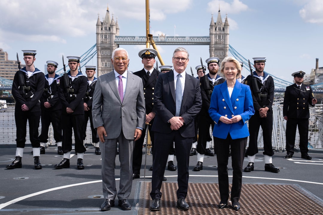 圖集1/2:英國-歐盟峯會結束後,歐洲理事會主席安東尼奧·科斯塔、英國首相基爾·斯塔默與歐盟委員會主席烏爾蘇拉·馮德萊恩在倫敦市中心23型護衞艦"薩瑟蘭號"上與皇家海軍成員合影。拍攝日期:2025年5月19日星期一。斯蒂芬·盧梭/路透社