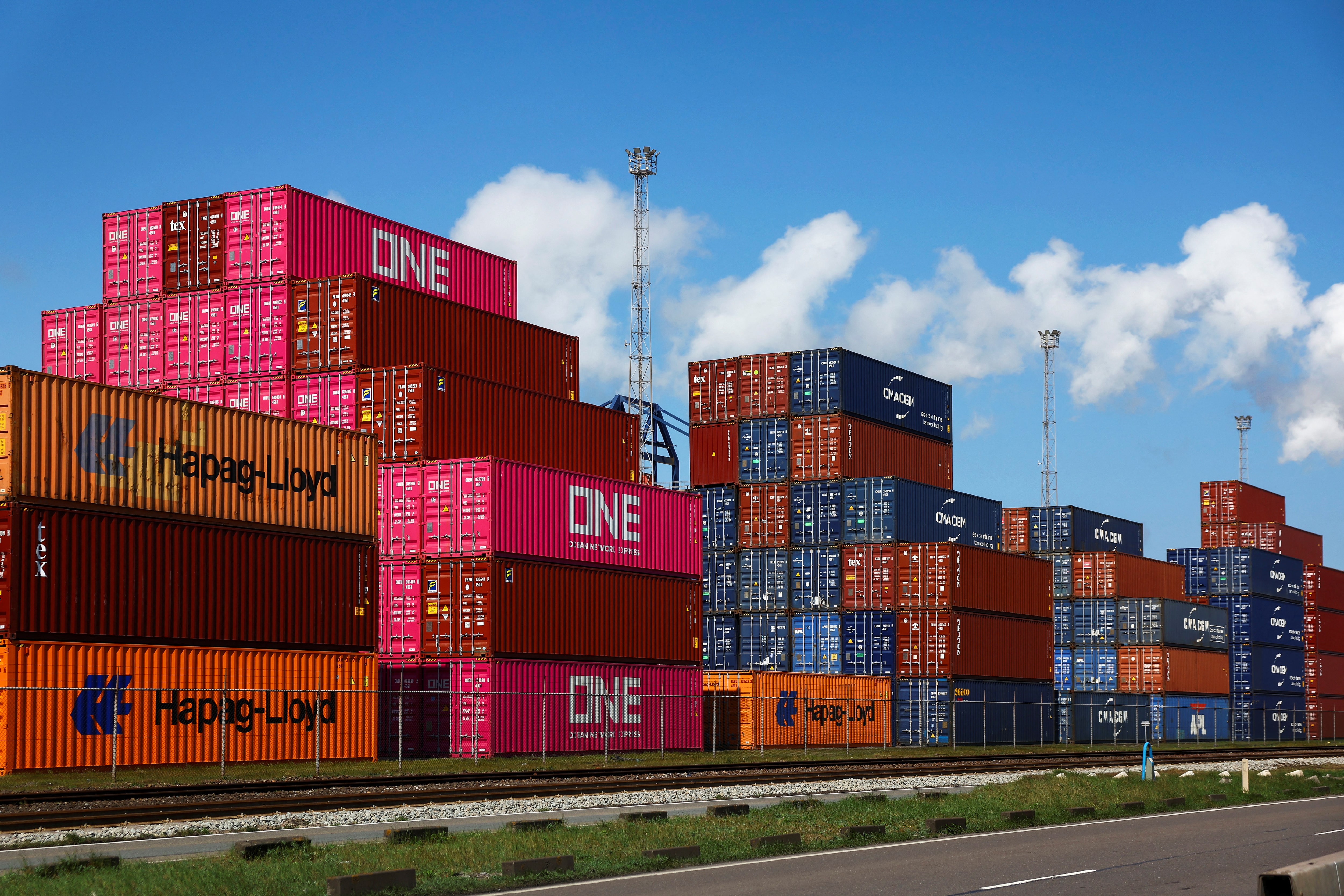 2025年4月25日,荷蘭鹿特丹港堆放的集裝箱。路透社/Piroschka van de Wouw/資料圖路透社5月20日電 - 據英國《金融時報》週二援引提案報道,歐盟計劃對進入該地區的數十億件小包裹徵收統一費用,這些包裹主要來自中國。