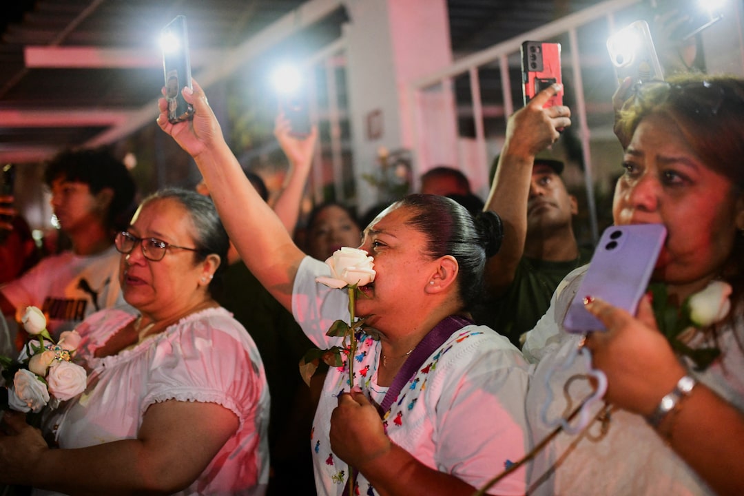 2025年5月19日,墨西哥哈拉帕,當美國海軍學員阿梅里卡·桑切斯的靈柩抵達守靈儀式現場時,人們做出反應。桑切斯是在墨西哥海軍艦艇誇烏特莫克號撞擊紐約布魯克林大橋事故中遇難的學員。路透社/奧斯卡·馬丁內斯,墨西哥,2025年5月19日。路透社/奧斯卡·馬丁內斯