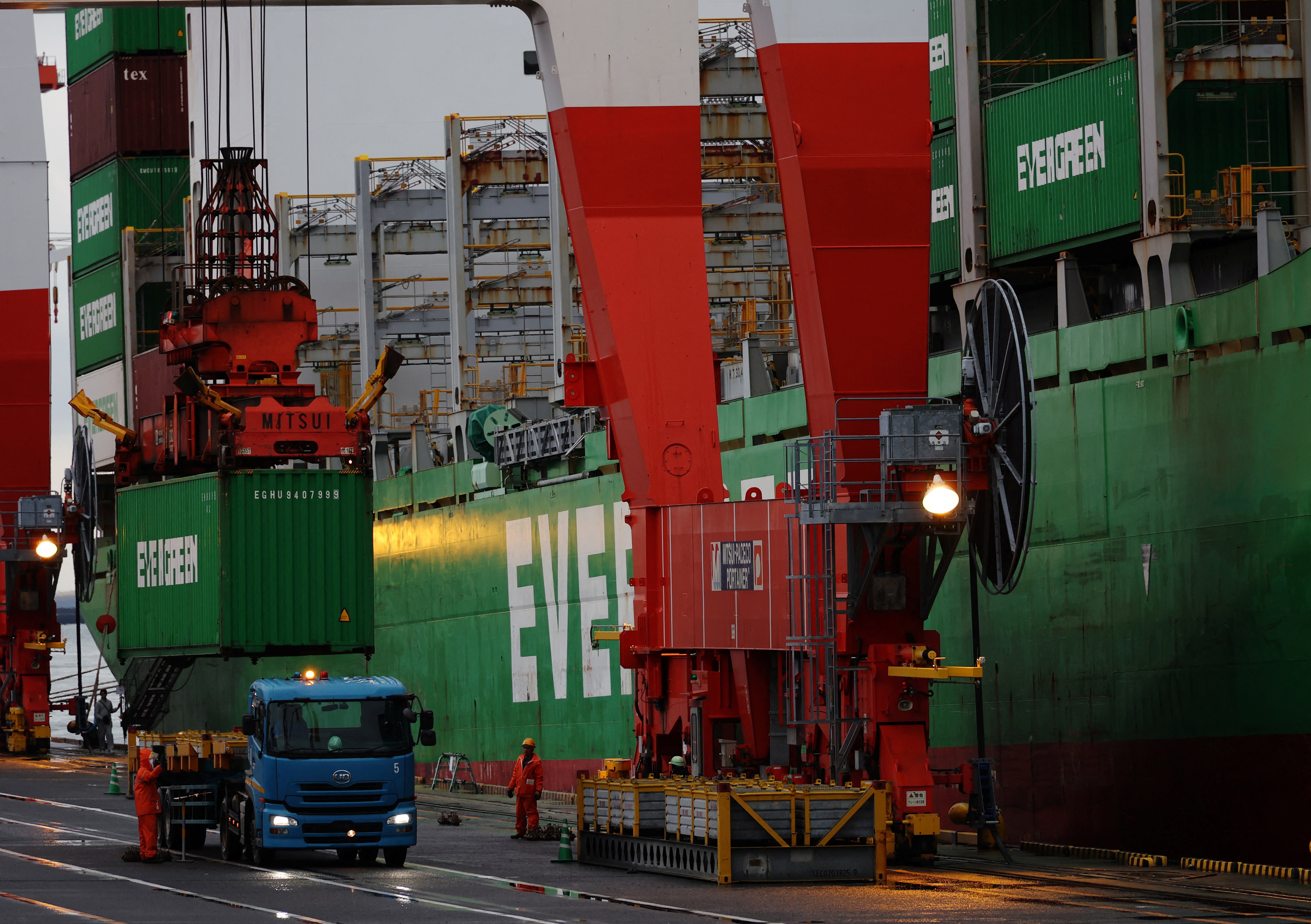 2025年4月3日,日本東京某工業港口,工人正在貨輪上裝載集裝箱。路透社/Kim Kyung-Hoon 東京,5月21日(路透社)——日本財務省週三數據顯示,4月出口同比增長2%,但對美出口下降1.8%。