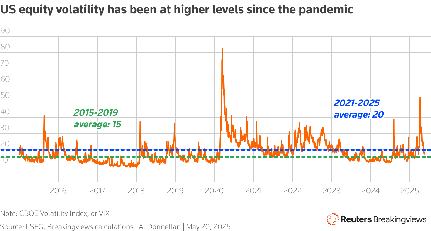 2025年4月11日,美國紐約市,紐約證券交易所(NYSE)收盤後,屏幕上顯示道瓊斯工業平均指數圖表。路透社/Brendan McDermid倫敦,5月21日(路透社Breakingviews)- 即便是最漫不經心的股市觀察者,可能也注意到了近期企業財報公佈後股價的極端反應。例如在四月末同一天,軟件集團ServiceNow(NOW.N),新開標籤頁和玩具製造商孩之寶(HAS.O),新開標籤頁因季度業績獲投資者青睞而大漲15%,而支付處理商Fiserv(FI.N),新開標籤頁則暴跌19%。與此同時上週在大西洋彼岸,英國時尚品牌巴寶莉(BRBY.L),新開標籤頁飆升17%,法國列車製造商阿爾斯通(ALSO.PA),新開標籤頁卻以相同幅度暴跌。證據表明,劇烈價格波動正變得越來越普遍,其中部分波動可能短暫超出了消息面合理性範圍。其背後原因——快錢對沖基金與被動投資的疊加效應——聽起來或許晦澀,但後果可能非常嚴峻:上市公司可能更傾向於私有化,而未上市企業或許從一開始就會降低IPO意願。