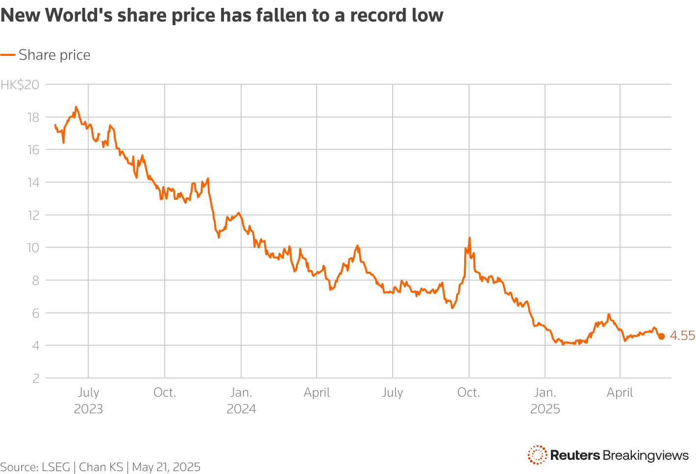 2024年9月27日,一名男子走過位於中國香港新世界大廈的新世界發展總部。路透社/Tyrone Siu 香港,5月21日(路透Breakingviews)- 滙豐銀行(HSBA.L),新開標籤頁及其同行銀行面臨新世界發展(0017.HK),新開標籤頁的難題。這家虧損的香港地產集團希望為110億美元貸款進行再融資,但CEO黃少媚尚未扭轉持續四年的營收下滑,新開標籤頁。銀行必須權衡借款方的問題與違約可能對其在香港其他地產敞口造成的衝擊。