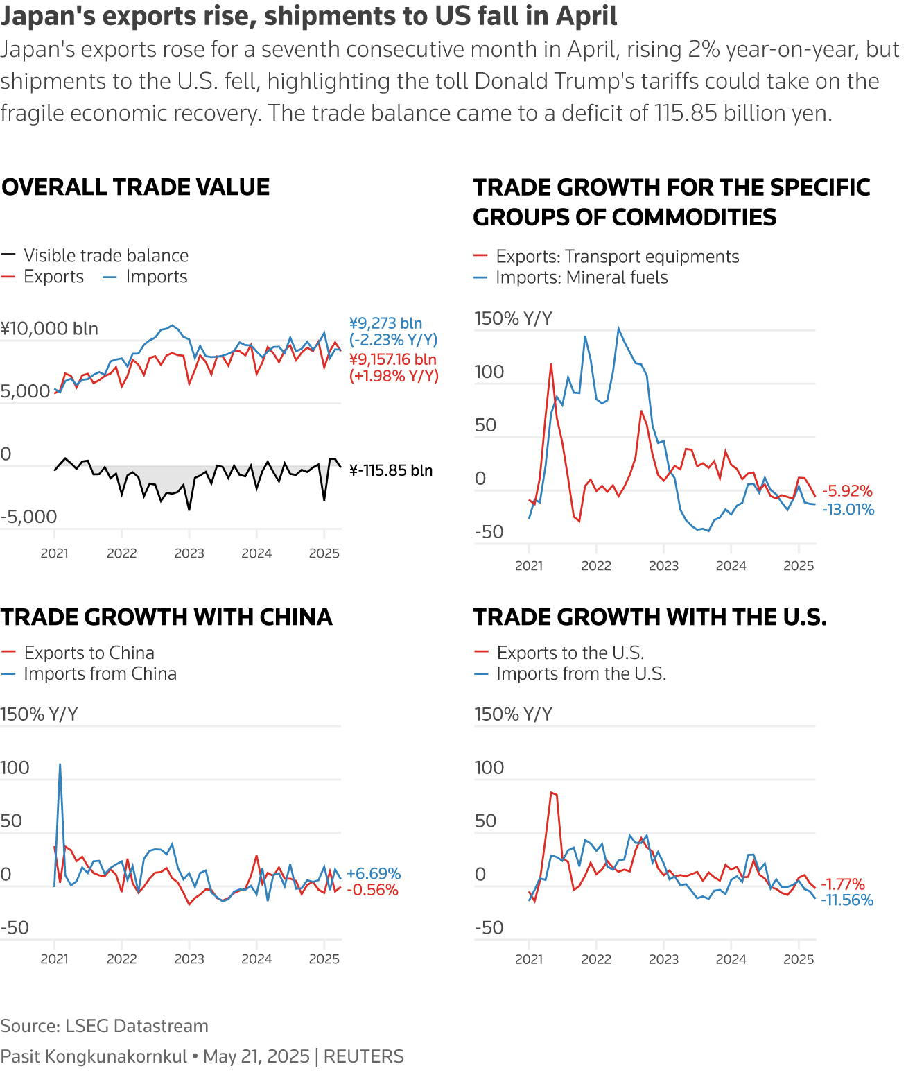 路透社東京5月21日電 - 日本4月出口增速放緩,主要受對美出口下降拖累。當前全球第四大經濟體的企業正為特朗普總統關税政策對脆弱經濟復甦的影響做準備。