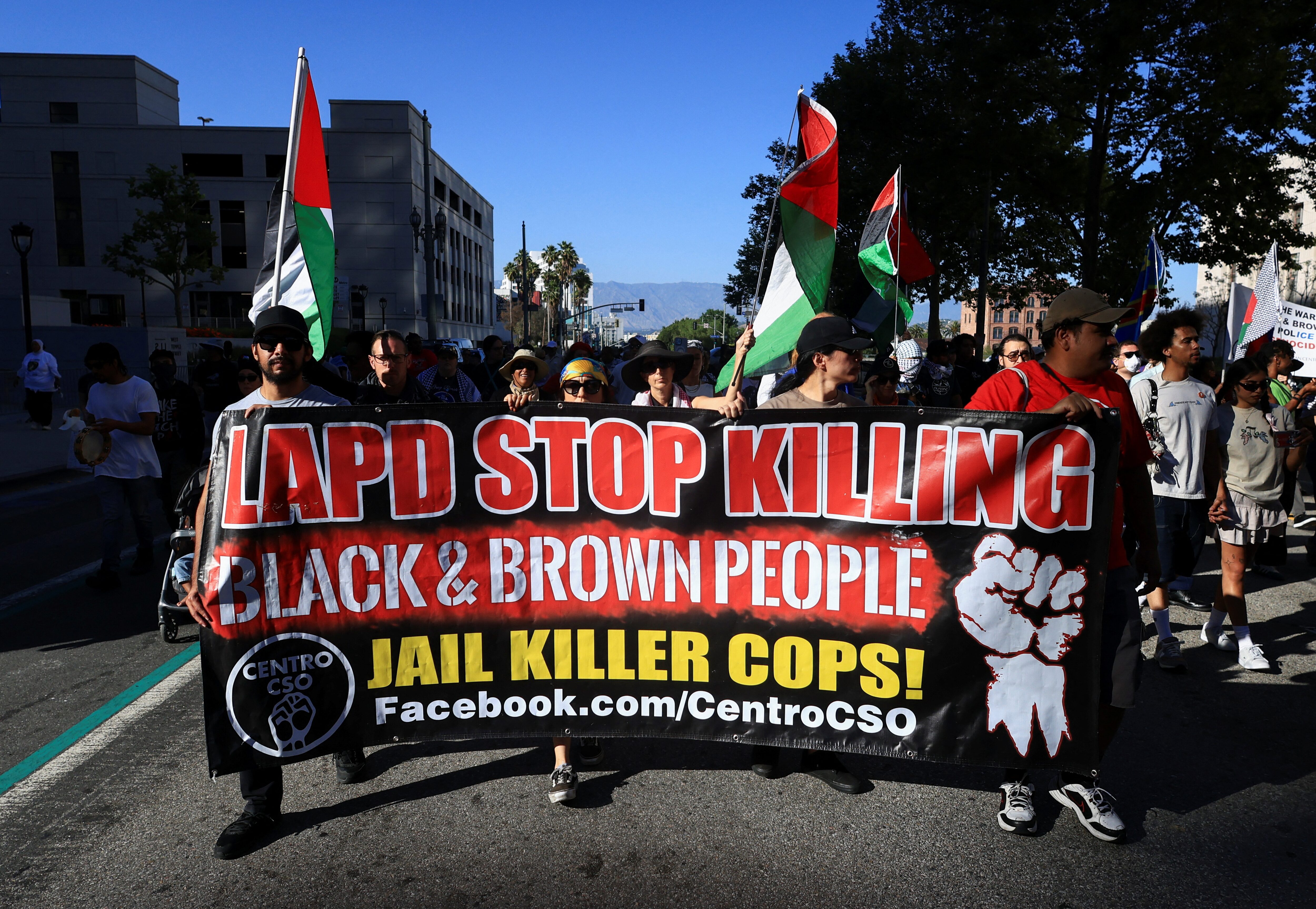 2025年5月21日,美國加利福尼亞州洛杉磯,示威者高舉橫幅和巴勒斯坦旗幟遊行,“黑人的命也是命"活動人士和支持者聚集紀念2020年5月25日喬治·弗洛伊德在明尼阿波里斯被謀殺五週年。路透社/David Swanson/檔案照片5月22日(路透社)- 在美國司法部宣佈將撤銷針對警察部門(其警員殺害了手無寸鐵的黑人)的訴訟後,警察改革倡導者承諾將在地方層面加大努力。