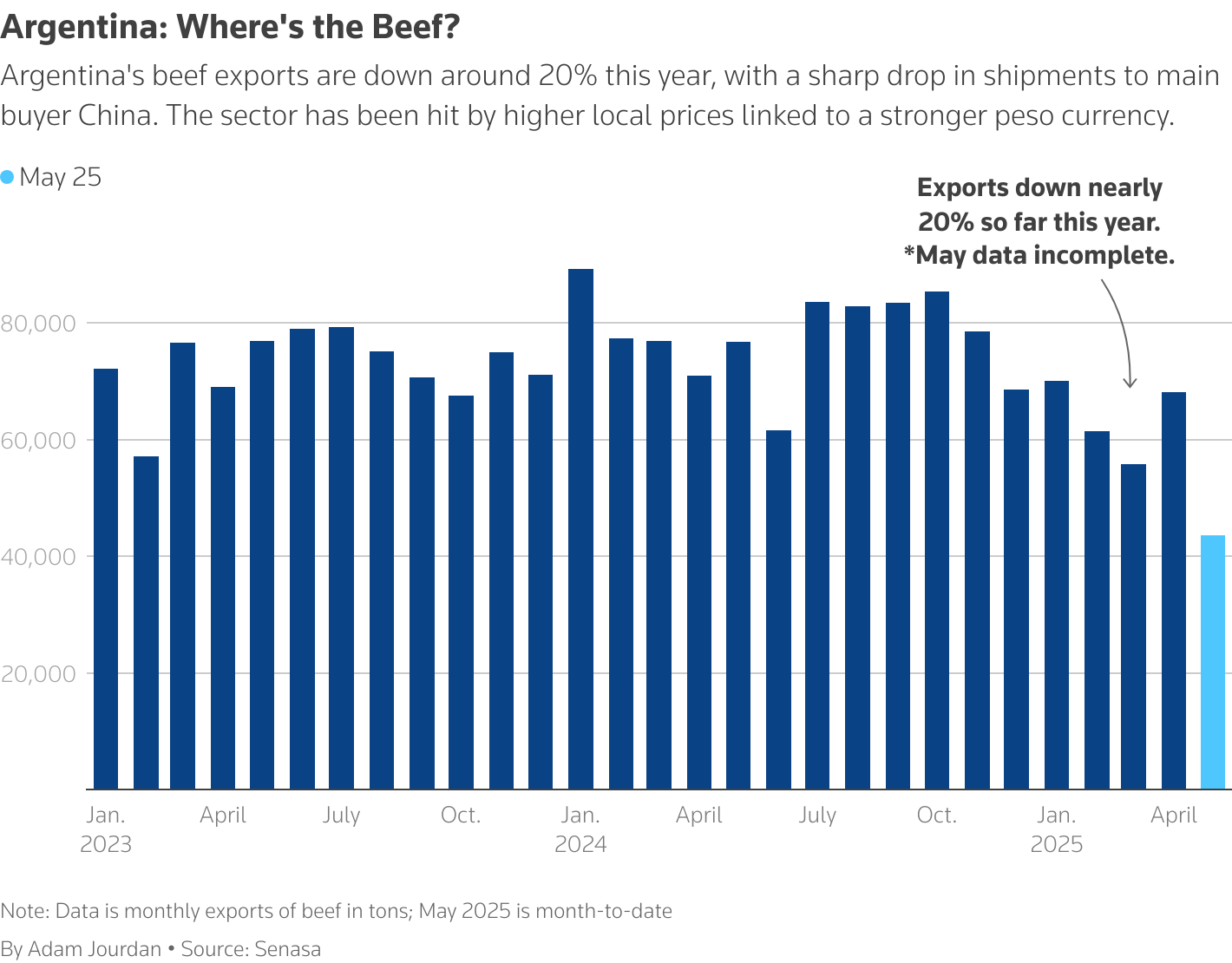 政府機構Senasa數據顯示,今年前四個月牛肉出口量同比下降近20%至約25.5萬噸。對價格敏感的最大買家中國的出口量從去年同期的20.3萬噸驟降至13.7萬噸。