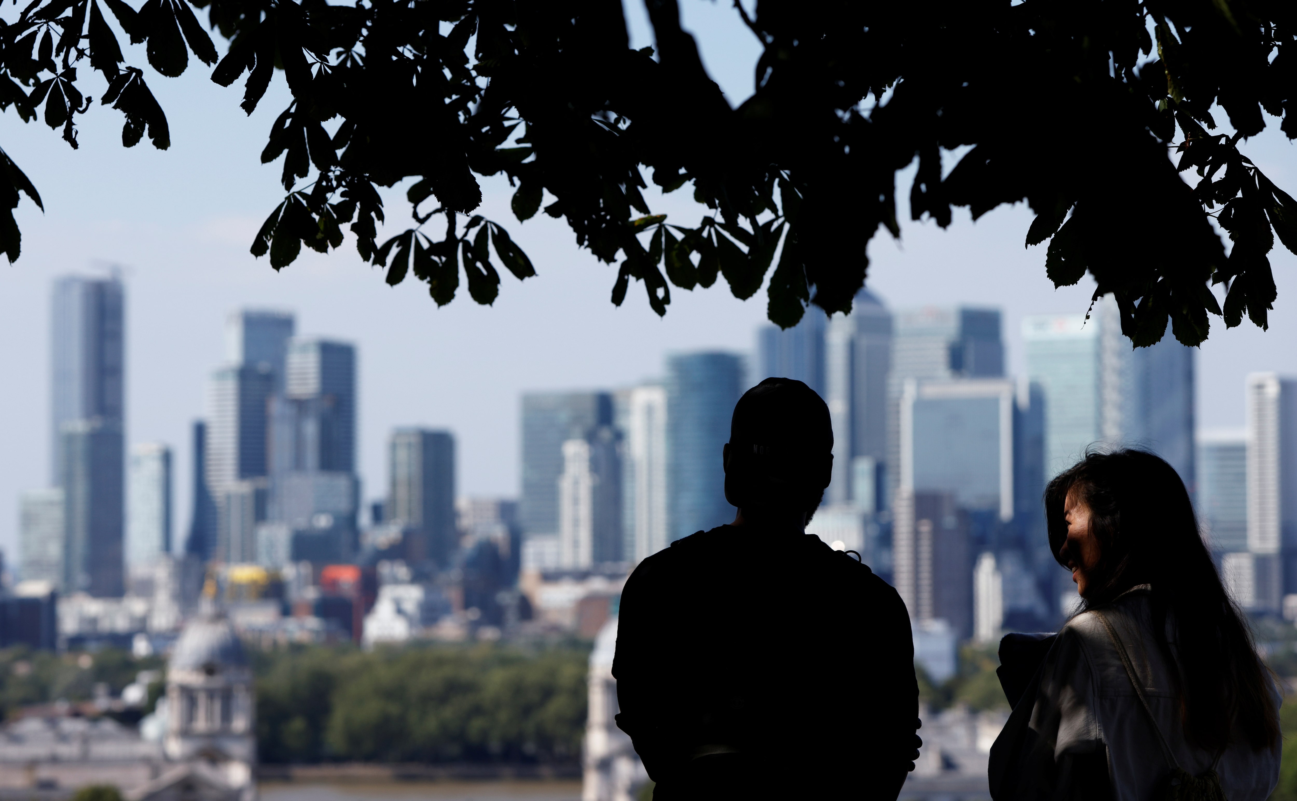 2020年8月7日,英國倫敦,人們在格林威治公園享受陽光明媚的天氣,背景是金絲雀碼頭金融區。路透社/約翰·西布利/資料圖片路透社英國曼徹斯特5月22日電 - 週四公佈的一項調查顯示,儘管製造業前景黯淡,企業裁員速度創下近20年前全球金融危機以來最快水平之一,但5月份英國企業下滑趨勢有所緩解。