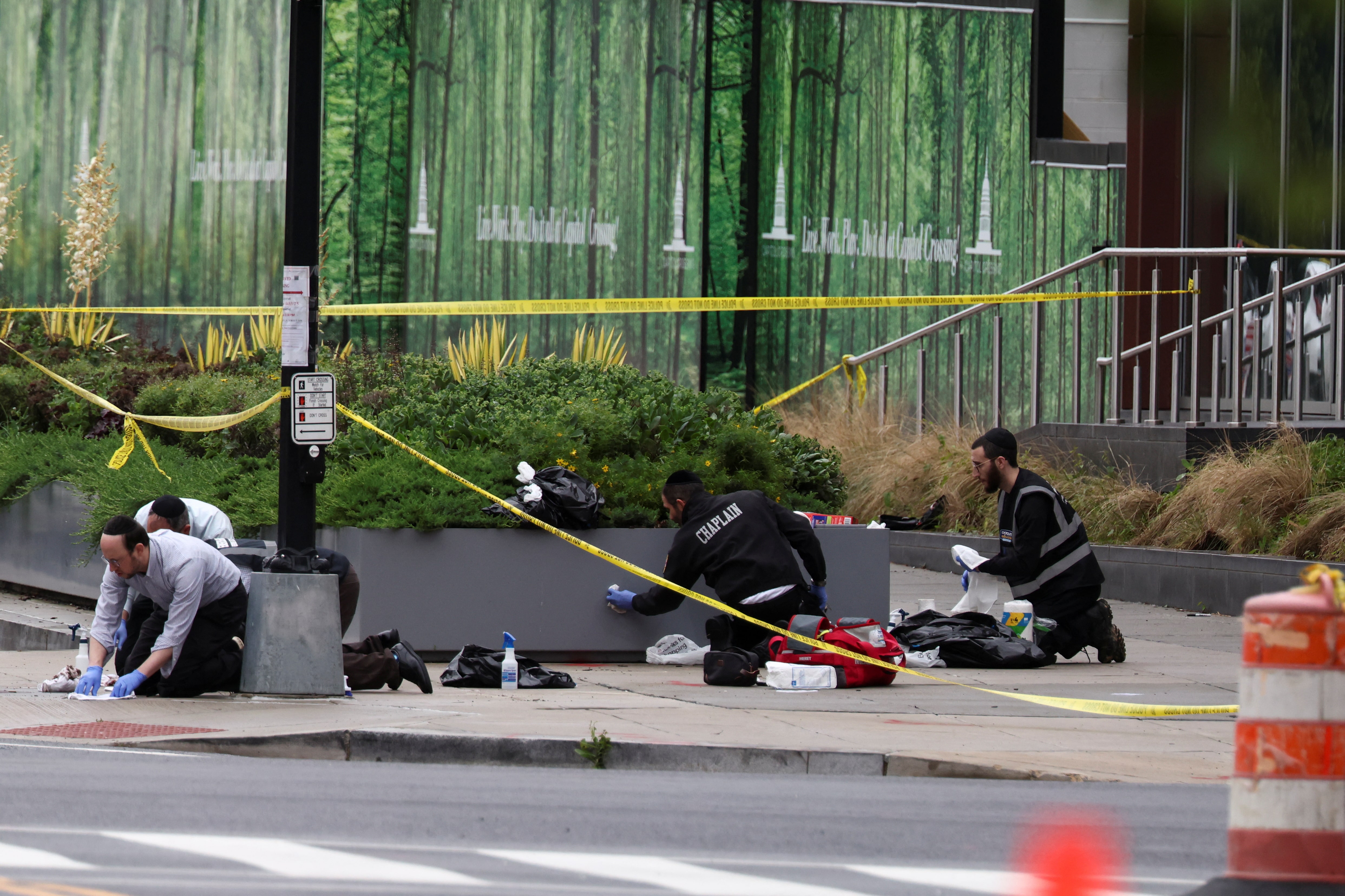 2025年5月22日,美國華盛頓特區首都猶太博物館附近,米薩斯基姆組織成員正在清理兩名以色列使館工作人員遭槍殺現場的血跡。路透社/伊芙琳·霍克斯坦 5月22日(路透社) - 官員表示,週三華盛頓特區一名獨行槍手殺害了兩名以色列使館工作人員,一名高喊親巴勒斯坦口號的嫌疑人已被拘留。自2023年10月哈馬斯領導的武裝分子襲擊以色列及以軍隨後在加沙發動軍事進攻以來,全球範圍內針對猶太人和猶太目標的襲擊事件激增。路透社關税觀察日報是您獲取全球貿易與關税最新動態的每日指南。立即訂閲