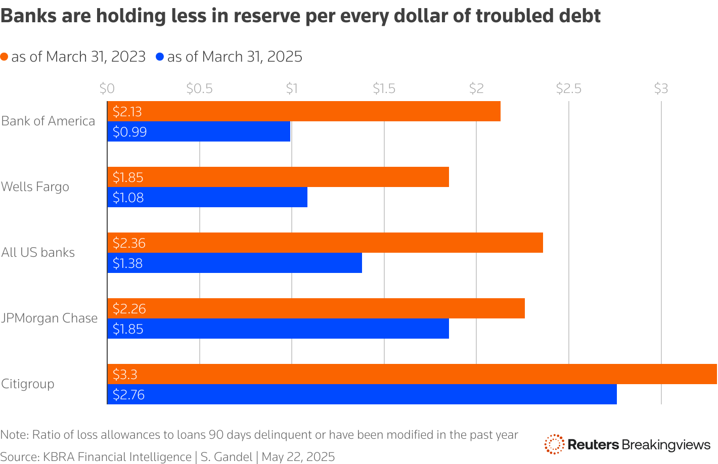壓力攀升似乎已成定勢。特朗普總統混亂的關税政策衝擊市場,消費者信心持續下滑。美國銀行高管雖承認存在波動,但多數表示其貸款賬簿風險可控。事實上,新增違約已有所放緩。根據聯邦存款保險公司(新標籤頁打開)數據,2024年第一季度至2025年間,逾期90天以上的貸款增加100億美元,較此前12個月250億美元的增幅有所改善。但近九成的改善似乎來自貸款條款修改——此類操作同期增加了150億美元。即便不考慮這些因素,用於覆蓋違約損失的資產池也在縮水。目前美國銀行平均每1美元逾期債務僅對應2.08美元準備金,低於兩年前的2.78美元。若計入貸款修改因素,全美銀行平均覆蓋率更將降至1.38美元。
