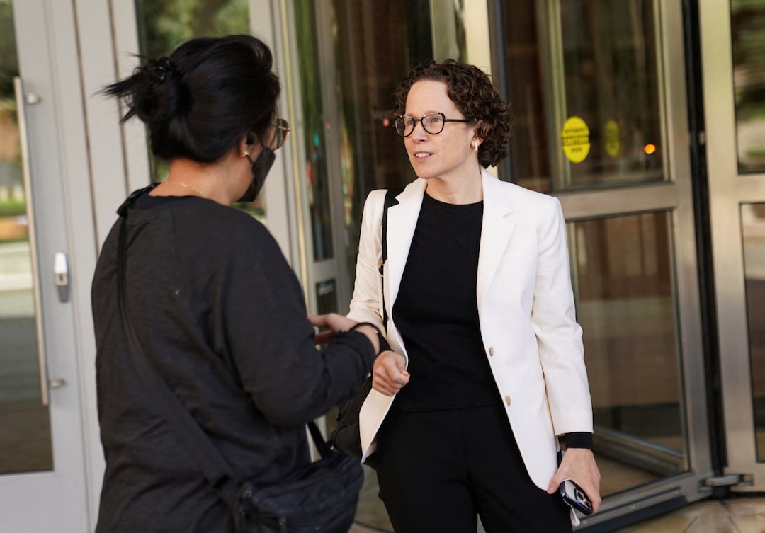 圖集1/3:2024年9月9日,美國弗吉尼亞州亞歷山大市,律師凱倫·鄧恩在美國地方法院外與同事交談。路透社/凱文·拉馬克/檔案照片