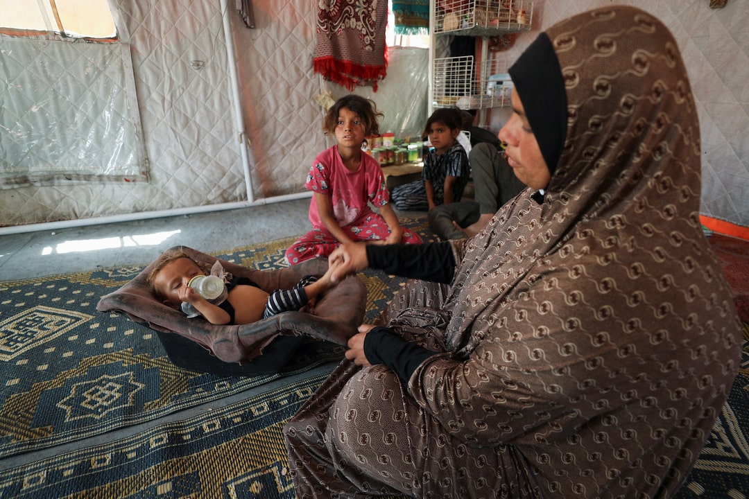 2025年5月22日,加沙城,巴勒斯坦婦女梅爾瓦特·希賈茲在流離失所後棲身的帳篷內洗衣服。路透社/馬哈茂德·伊薩開羅/加沙城,5月24日(路透社)——梅爾瓦特·希賈茲和她的九個孩子在週四一整天都沒有吃東西——除了她體重不足的嬰兒,他吃了一小包花生醬。
