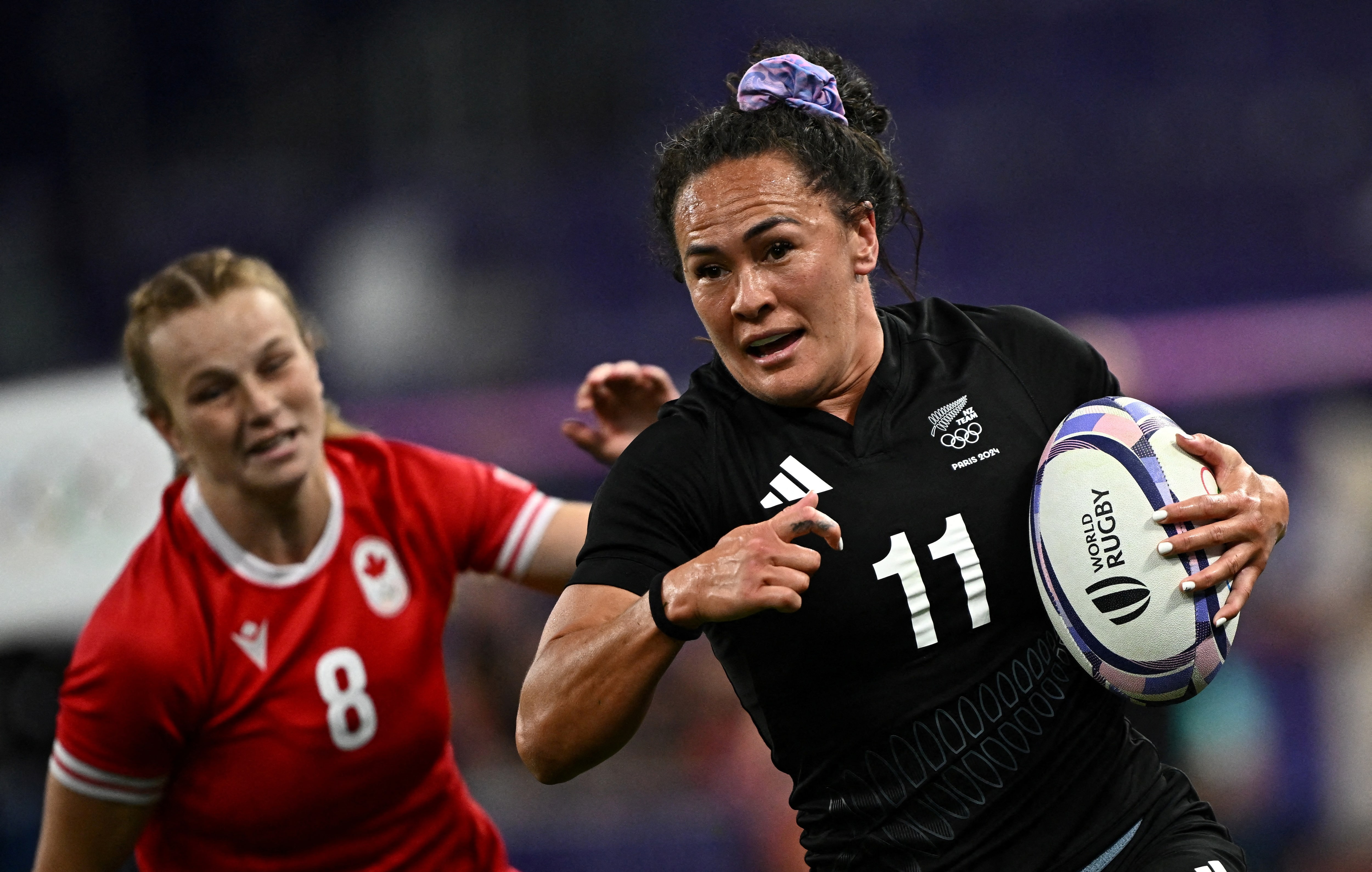 2024年巴黎奧運會——七人制橄欖球——女子A組——新西蘭對加拿大——法國聖但尼法蘭西體育場——2024年7月28日。新西蘭選手波西亞·伍德曼-威克利夫與加拿大選手卡麗莎·諾爾斯滕在比賽中 路透社/迪倫·馬丁內斯/資料圖片路透悉尼5月26日電——波西亞·伍德曼-威克利夫復出後的首秀為新西蘭隊帶來豐厚回報,這位資深邊鋒在上週末的比賽中獨中七元,助世界冠軍以79-14狂勝美國隊,成功衞冕太平洋四國賽冠軍。