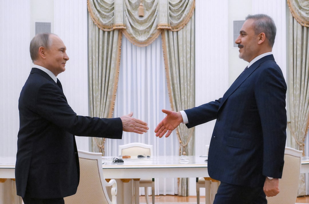 圖集1/3:2025年5月26日,俄羅斯總統弗拉基米爾·普京與土耳其外交部長哈坎·菲丹在莫斯科克裏姆林宮會晤前握手合影。衞星通訊社/阿列克謝·邁舍夫/路透社供圖 編者注:本圖片由第三方提供。