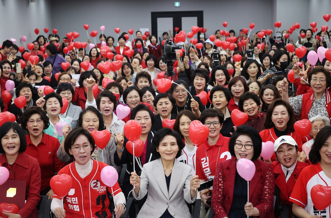 2025年5月21日,韓國保守派國民力量黨總統候選人金文洙的妻子薛蘭英在首爾黨部活動中與女性支持者合影。路透社/Kim Hong-Ji(路透首爾5月27日電)韓國主要保守黨派候選人的妻子在下週大選前扮演了關鍵角色,通過獨立競選活動抹黑自由派領先候選人及其配偶的形象,同時為丈夫的競選注入強心針。