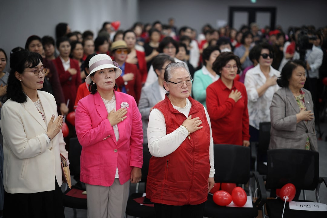圖集1/5:2025年5月21日,韓國保守派國民力量黨總統候選人金文洙的妻子薛蘭英在首爾黨部活動中與女性支持者合影。路透社/Kim Hong-Ji
