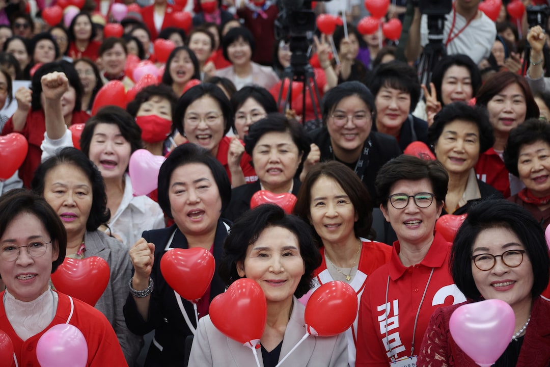 圖集1/5:2025年5月21日,韓國保守派國民力量黨總統候選人金文洙的妻子薛蘭英在首爾黨部活動中與女性支持者合影。路透社/Kim Hong-Ji