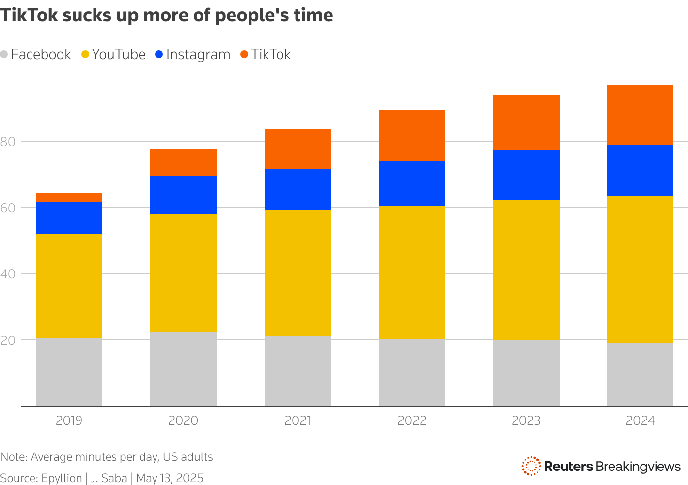 Meta的核心應用Facebook始於2004年。Snap於2011年跟進,而TikTok則發佈於2016年。風險在於每個新入局者都通過微創新蠶食用户有限的每日使用時長。以字節跳動旗下的短視頻應用為例。諮詢公司Epyllion分析顯示,2019年TikTok平均每天消耗美國成年人2分鐘,五年後這一數字增長至近18分鐘。正如電視節目《倖存者》的成功引發各大電視台爭相複製真人秀模式,社交媒體領域也出現了防禦性模仿現象。Instagram和YouTube感知威脅後迅速推出了類似的短視頻信息流。正如Meta在法庭上承認的,經過初期衝擊後,所有應用最終都變得千篇一律。