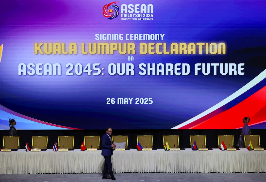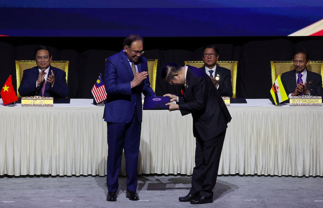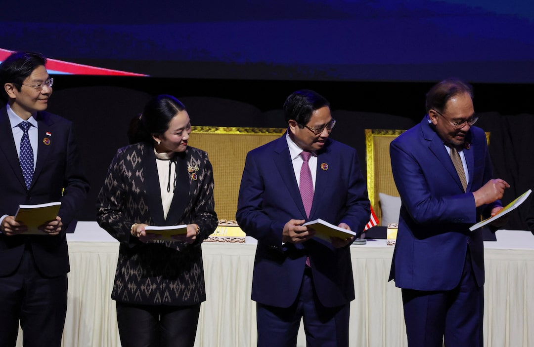 5項中的第1項 新加坡總理黃循財、泰國總理貝東丹·西那瓦和越南總理範明政正在查看馬來西亞總理安瓦爾·易卜拉欣手持的宣言文件,此前他們於2025年5月26日在馬來西亞吉隆坡會議中心舉行的第46屆東盟峯會上簽署了《吉隆坡宣言:東盟2045——我們共同的未來》。路透社/Hasnoor Hussain
