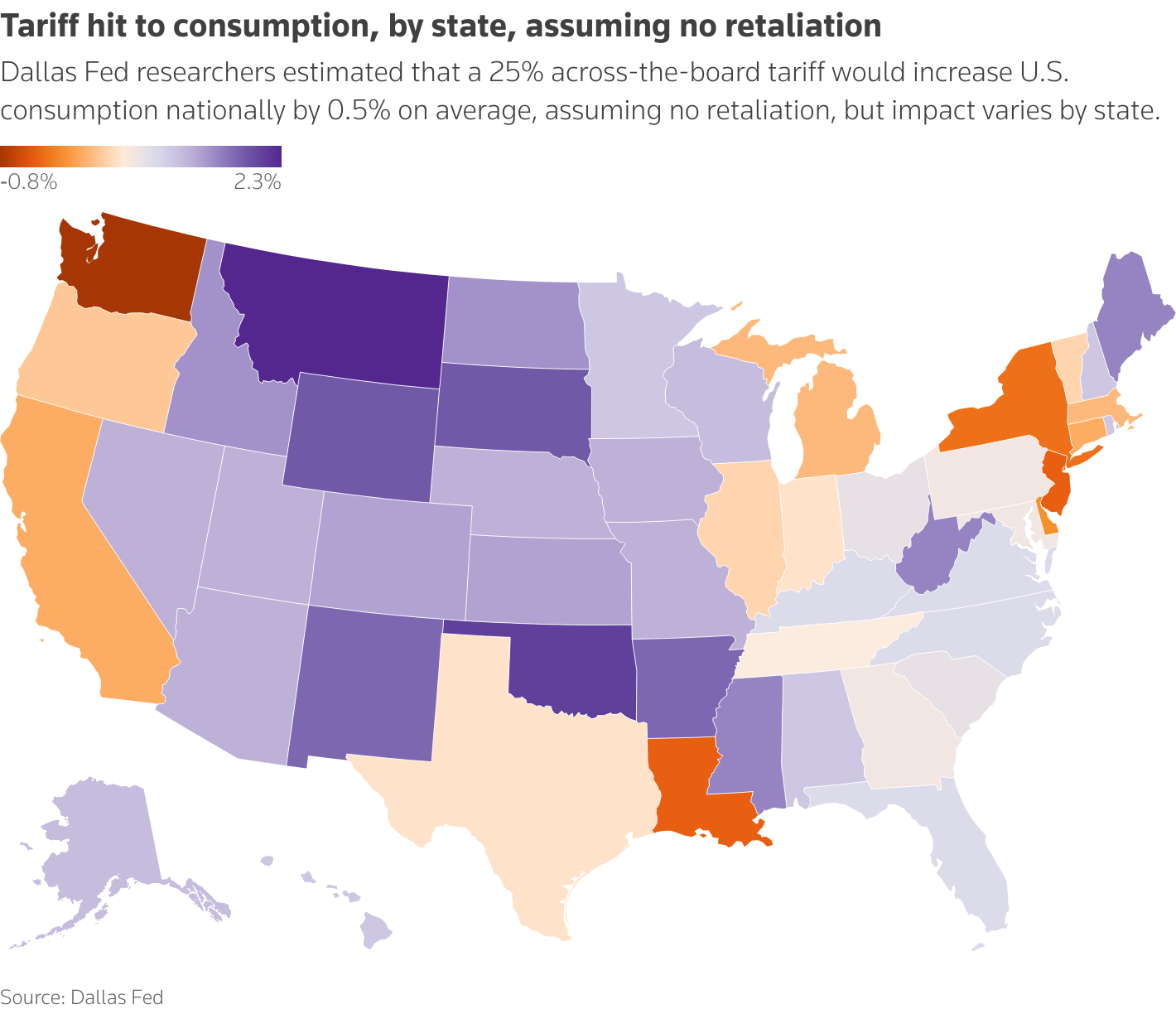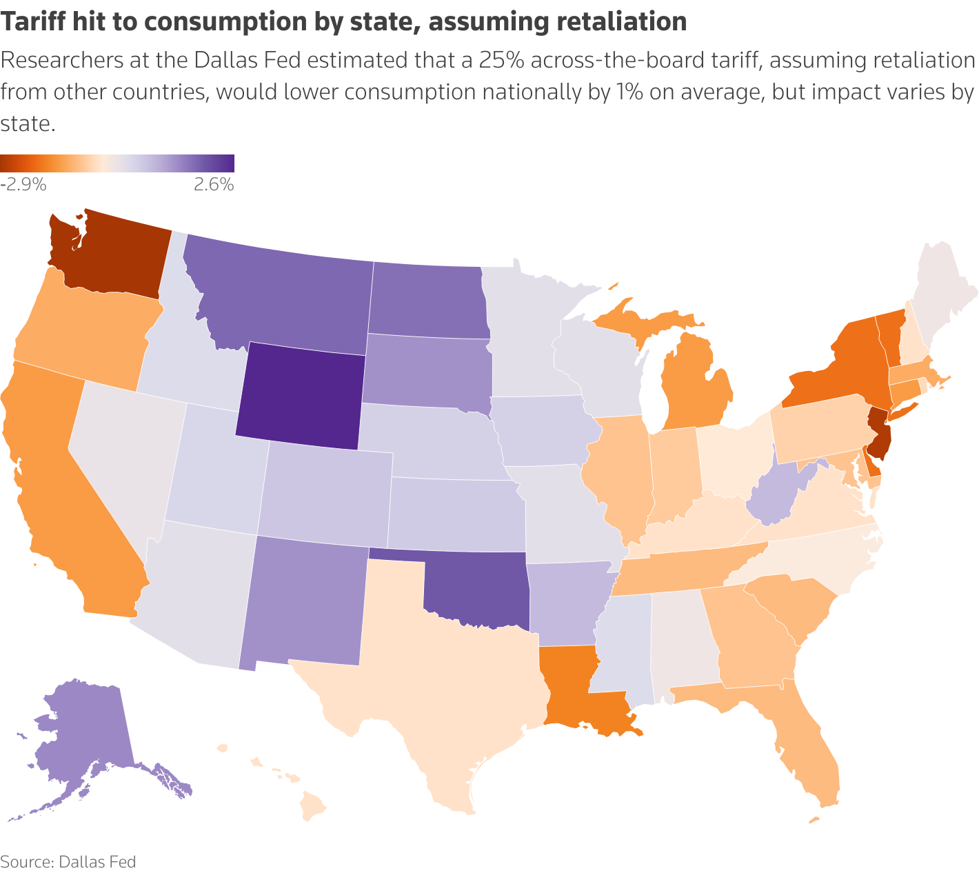 若實施報復性關税,將導致整體消費下降1%,各州受影響程度不均——從華盛頓州2.9%的降幅到懷俄明州2.6%的增長不等。與所有税收政策類似,關税影響因本地產業結構而異:那些深度參與全球供應鏈或居民消費更多進口商品的州份可能遭受更大沖擊。