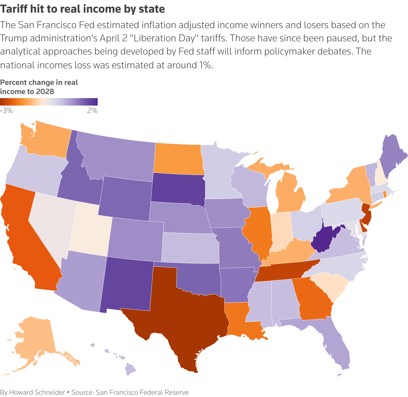 華盛頓/聖弗朗西斯科,5月27日(路透社)——自1月以來,美聯儲官員一直努力解讀特朗普政府的貿易政策對美國經濟意味着什麼,公佈的記錄顯示可能出現收入損失、通脹預估最高高出2個百分點,以及分析顯示各州的贏家和輸家。
