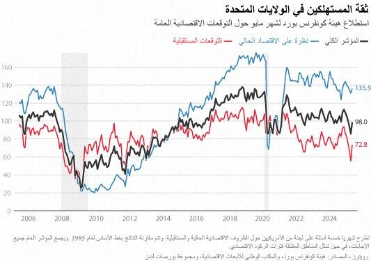 美國會議委員會5月經濟展望調查的示意圖。華盛頓5月27日(路透社)——隨着美中貿易戰緊張局勢緩和,儘管對關税影響價格和經濟的擔憂持續,美國消費者信心在連續五個月下滑後於5月有所改善。
