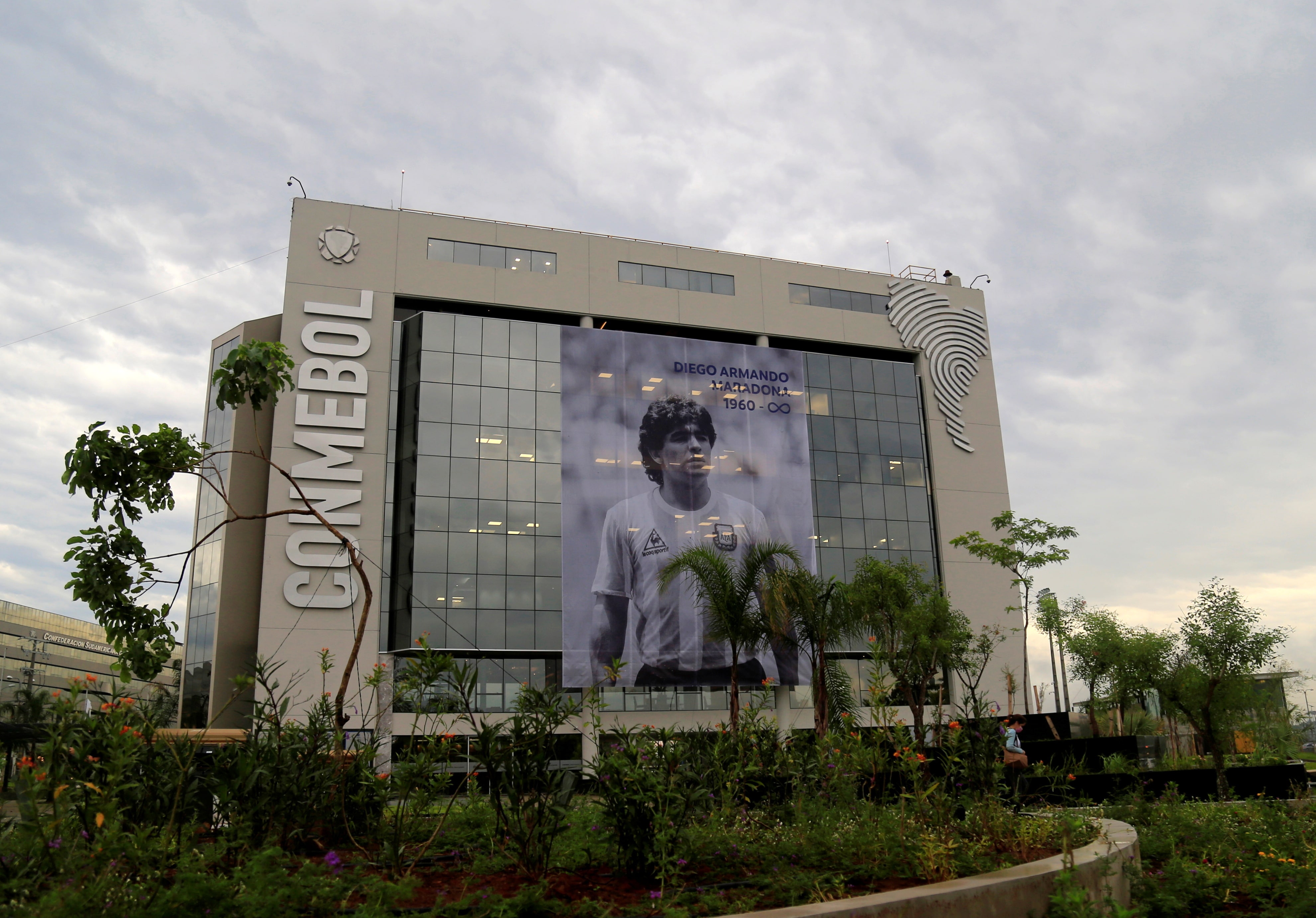 2020年11月26日,巴拉圭盧克,足球傳奇迭戈·馬拉多納去世後,其照片懸掛在南美足聯總部前。路透社/豪爾赫·阿多諾/資料圖片5月27日(路透社)——在阿根廷備受關注的迭戈·馬拉多納非正常死亡案審理中,三名主審法官之一於週二因涉嫌違規拍攝紀錄片引發的醜聞辭職,為案件後續審理帶來不確定性。