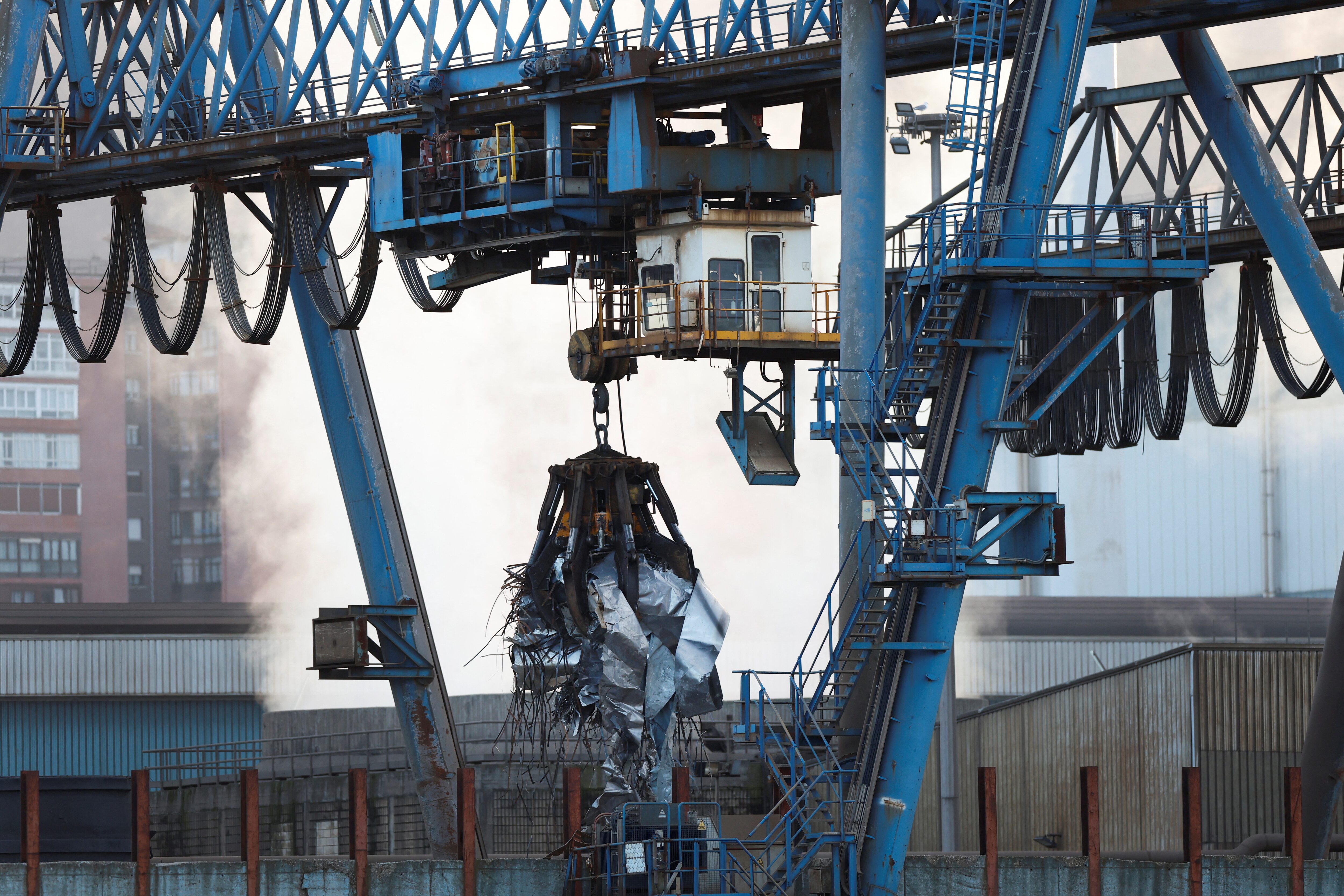 2025年2月12日,西班牙塞斯陶阿塞洛-米塔爾鋼鐵廠內起重機正在搬運回收金屬。路透社/文森特·韋斯特隨着英國政府就是否需要既能實現脱碳又能生產原鋼的產業作出決策,英國鋼鐵公司斯肯索普工廠最後幾座高爐正面臨存亡危機。關於直接還原鐵等技術在原鋼生產中的可行性評估結果尚未公佈。
