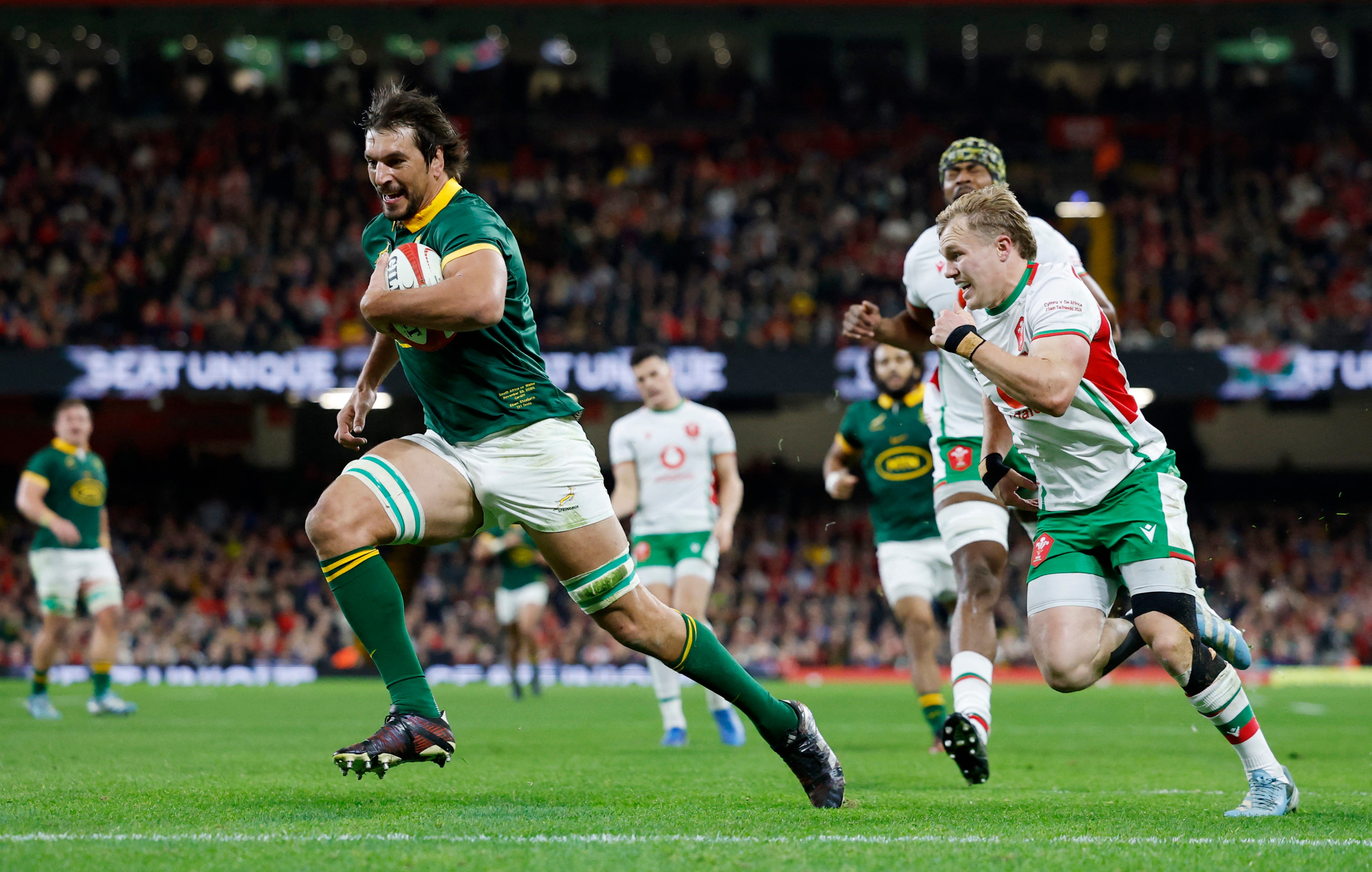 橄欖球聯盟 - 秋季國際賽 - 威爾士對陣南非 - 英國威爾士加的夫公國體育場 - 2024年11月23日 南非選手埃本·埃澤貝斯第二次達陣瞬間 路透社通過Action Images/Peter Cziborra/檔案照片 德班,5月28日(路透社) - 南非前鋒埃本·埃澤貝斯傷愈復出,對俱樂部和國家隊而言正值關鍵時刻:鯊魚隊將參加本週末的聯合橄欖球錦標賽四分之一決賽,而跳羚隊今年將開啓13場測試賽征程。