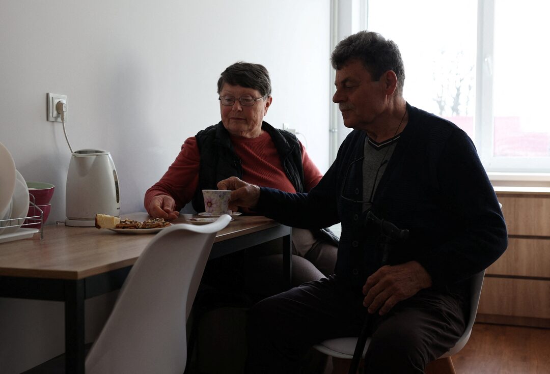 3項中的第1項 65歲的馬裏烏波爾流離失所居民柳德米拉·利特温和亞歷山大·利特温,在烏克蘭第聶伯羅的馬裏烏波爾難民住所接受記者採訪,背景是俄羅斯對烏克蘭的襲擊。2025年4月8日。路透社/Violeta Santos Moura