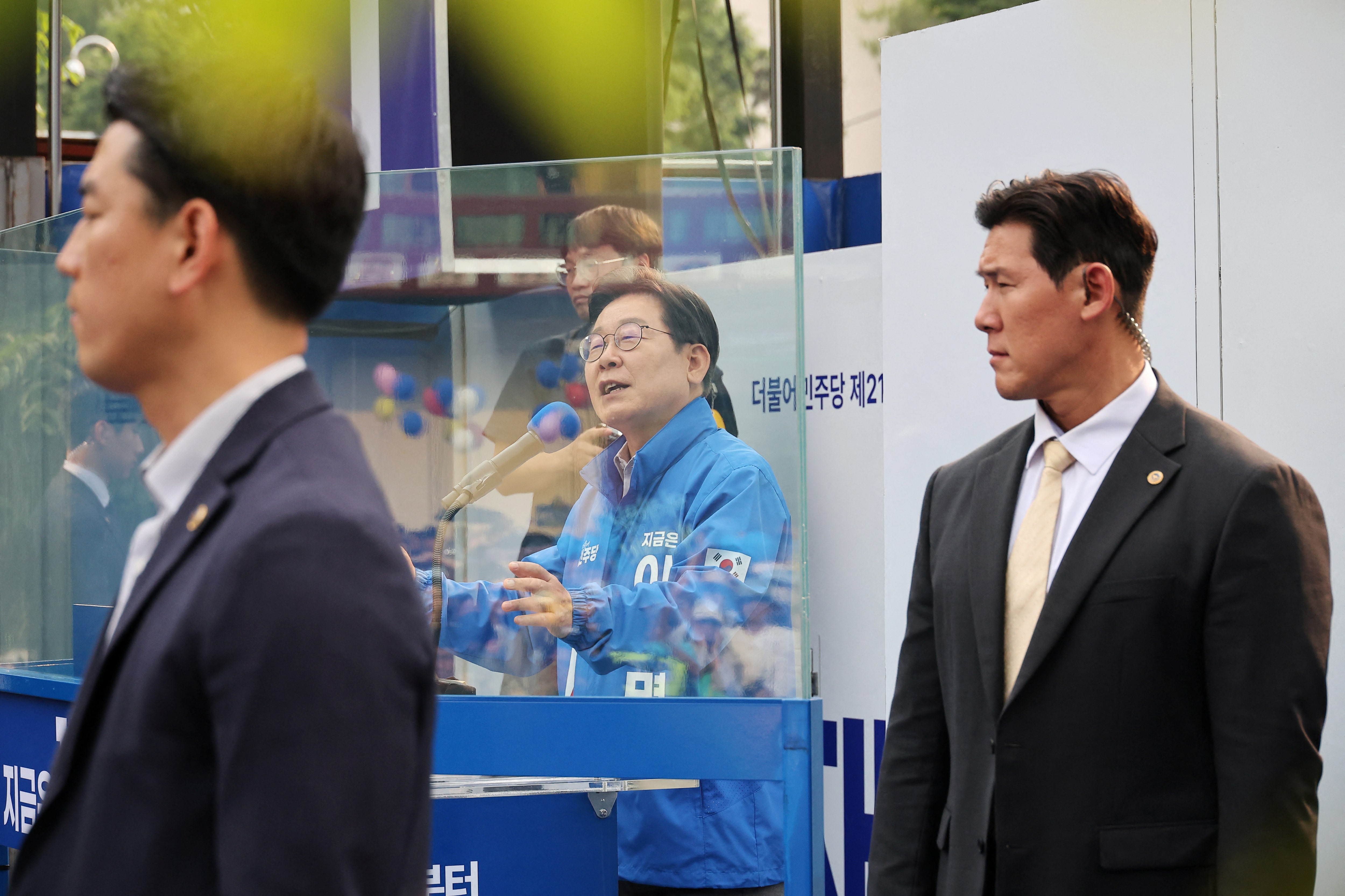 2025年5月28日,韓國首爾某公園舉行的競選集會上,韓國民主黨總統候選人李在明在防彈玻璃後發表演講,安保人員在一旁警戒。路透社/Kim Hong-Ji首爾,5月29日(路透社)——韓國自由派政治人物李在明在重返總統之位的意外征途中,先後經歷了持刀襲擊、戒嚴令和刑事指控的考驗,目前最被看好成為韓國下任領導人。