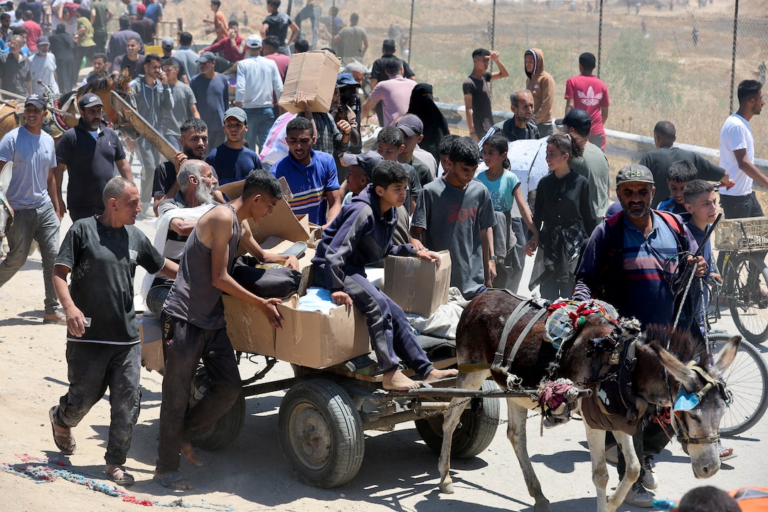 2025年5月29日,巴勒斯坦人牽着滿載美國支持的加沙人道主義基金會援助物資的驢車,行走在被稱為內察裏姆走廊的加沙地帶附近。路透社/拉馬丹·阿貝德對於與南部物資分發點隔絕的加沙北部居民而言,這些援助仍遙不可及。