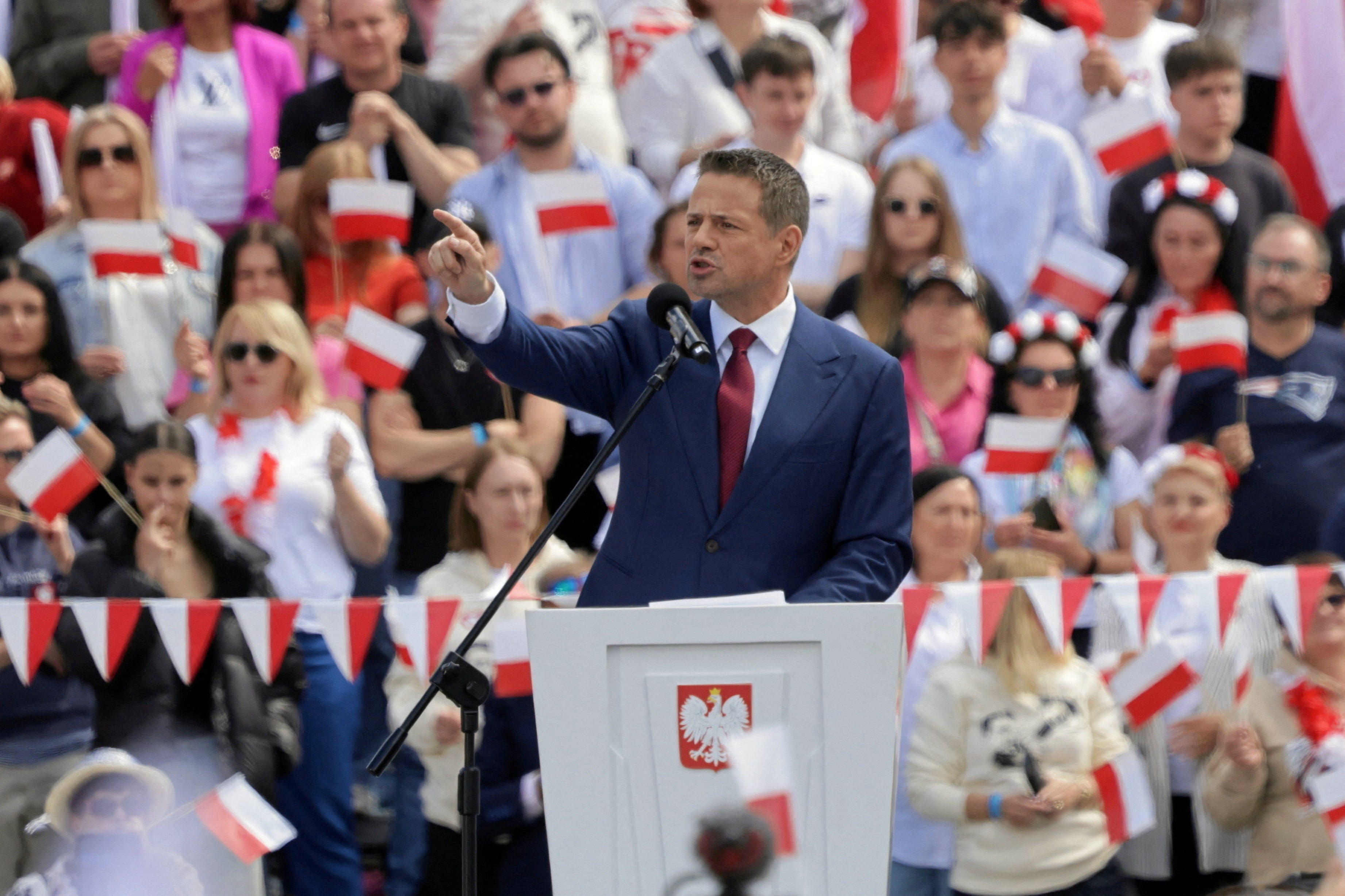2025年5月25日,波蘭華沙,公民聯盟總統候選人、華沙市長拉法爾·特扎斯科夫斯基在總統選舉第二輪投票前參加執政黨組織的"愛國遊行"活動並發表講話。Agencja Wyborcza.pl/Kuba Atys通過路透社/檔案照片華沙,5月29日(路透社)——週四由Opinia24為私營電視台TVN 24進行的民調顯示,在週日總統選舉第二輪投票前,波蘭執政黨公民聯盟(KO)候選人、華沙市長拉法爾·特扎斯科夫斯基在支持率上領先民族主義者卡羅爾·納夫羅茨基。