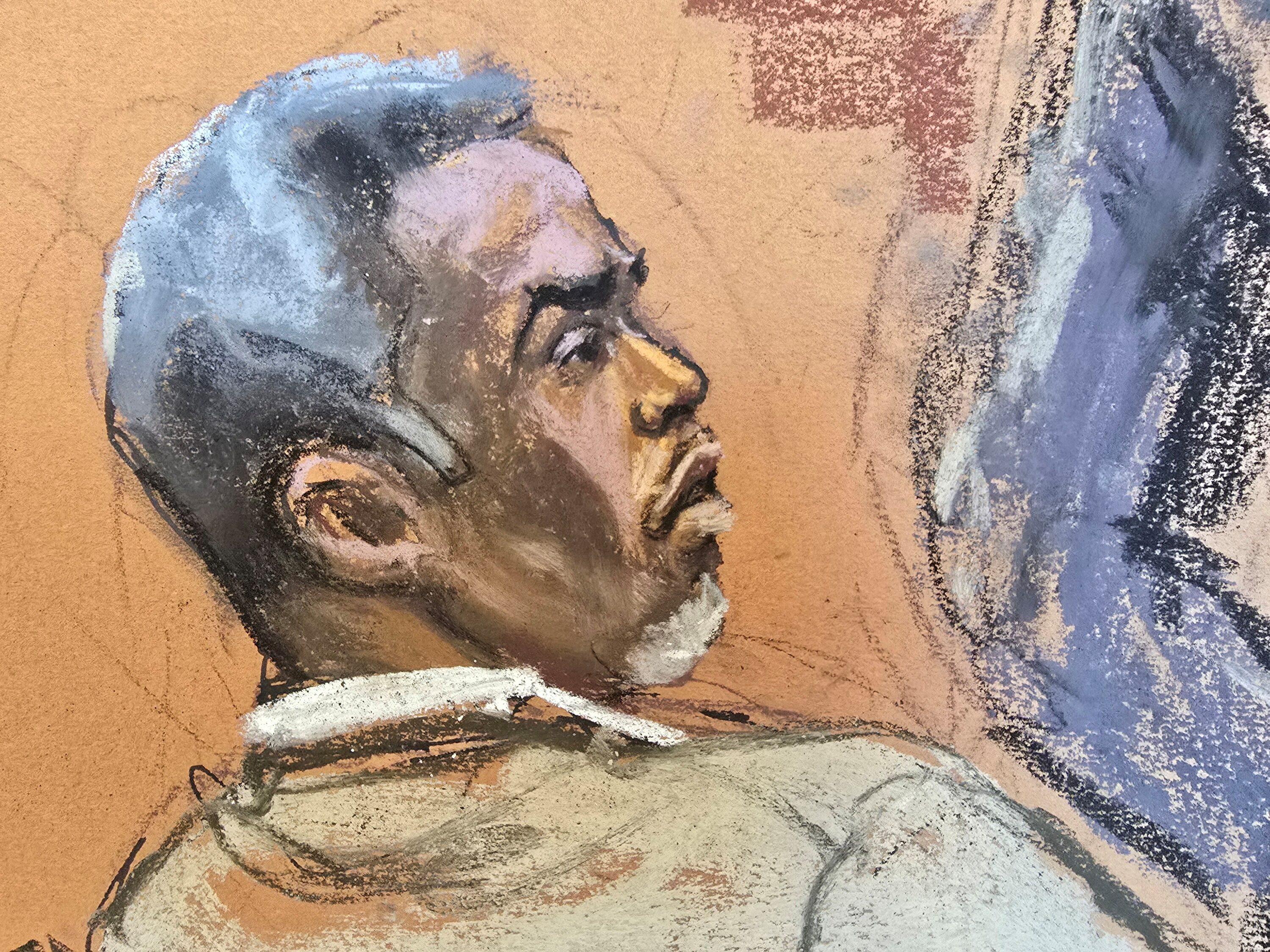 2025年5月29日,美國紐約,肖恩·“吹牛老爹”·庫姆斯在性交易案庭審中聽取律師澤維爾·唐納森質詢證人迪昂特·納什時的場景。法庭素描。路透社/簡·羅森伯格路透紐約5月29日電 - 週四第二名女性作證稱,肖恩·“吹牛老爹”·庫姆斯曾實施性侵,聯邦檢察官指控這位嘻哈大亨此舉是其性交易和有組織犯罪計劃的一部分。