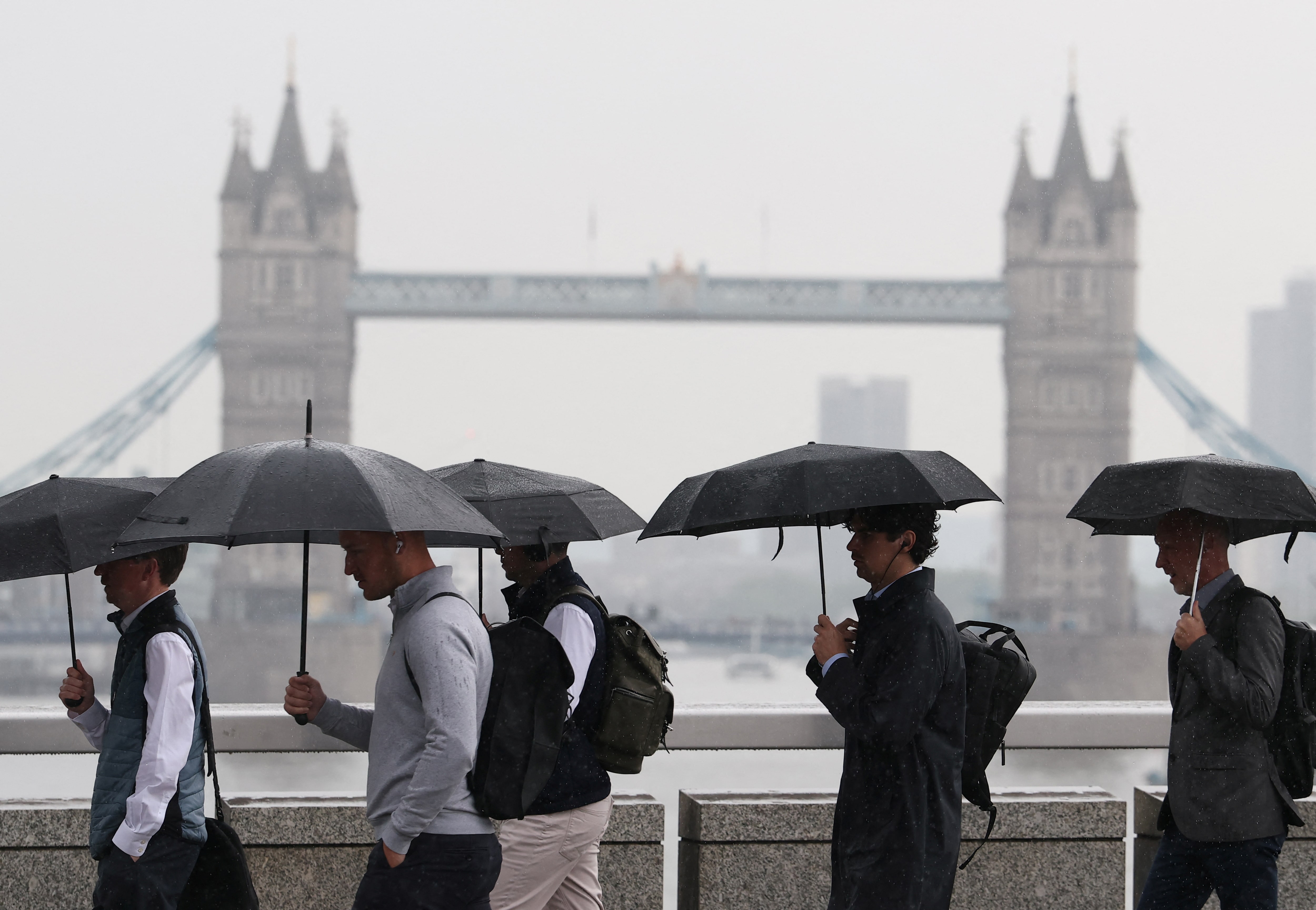 2025年5月21日早高峯期間,英國倫敦,工人們冒雨穿過倫敦橋,背景可見塔橋。路透社/Toby Melville/檔案照片路透倫敦5月29日電 - 花旗/YouGov週四公佈的調查顯示,5月份英國公眾對未來一年通脹預期從4.2%降至4.0%。