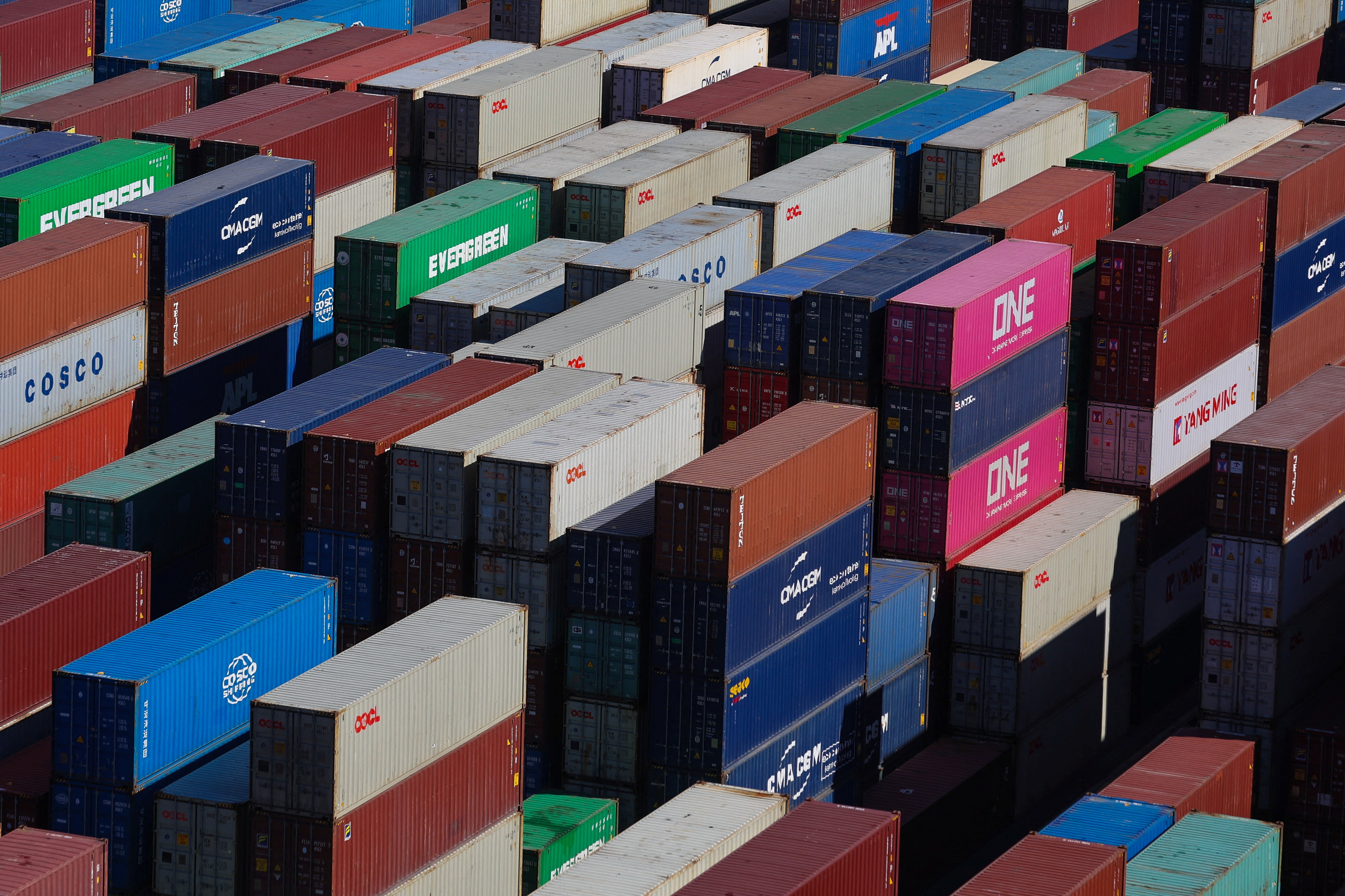 2023年2月9日,美國加州長灘,長灘集裝箱碼頭上展示的貨運集裝箱。路透社/Mike Blake/檔案照片5月29日(路透社)——據《華爾街日報》週四援引知情人士消息報道,特朗普政府正考慮根據現行法律對全球經濟大部分領域臨時加徵關税,該法律條款允許在150天內實施最高15%的關税。