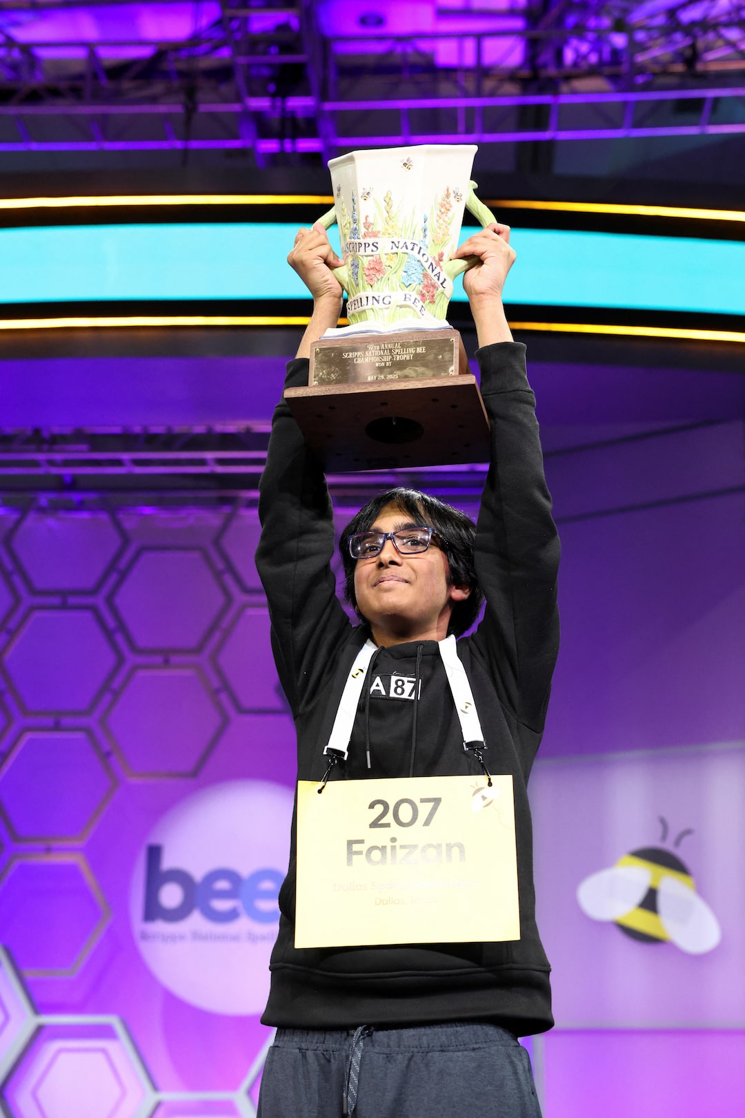2025年5月29日,美國馬里蘭州國家港,來自得克薩斯州達拉斯的13歲少年法伊贊·扎基在贏得年度斯克裏普斯全國拼字大賽後手持獎盃。路透社/凱文·拉馬克路透社5月29日電——週四,來自達拉斯地區的13歲少年法伊贊·扎基在第97屆斯克裏普斯全國拼字大賽決賽第21輪中,迅速準確地拼出源自法語的單詞"eclaircissement"(意為啓蒙),最終奪冠。