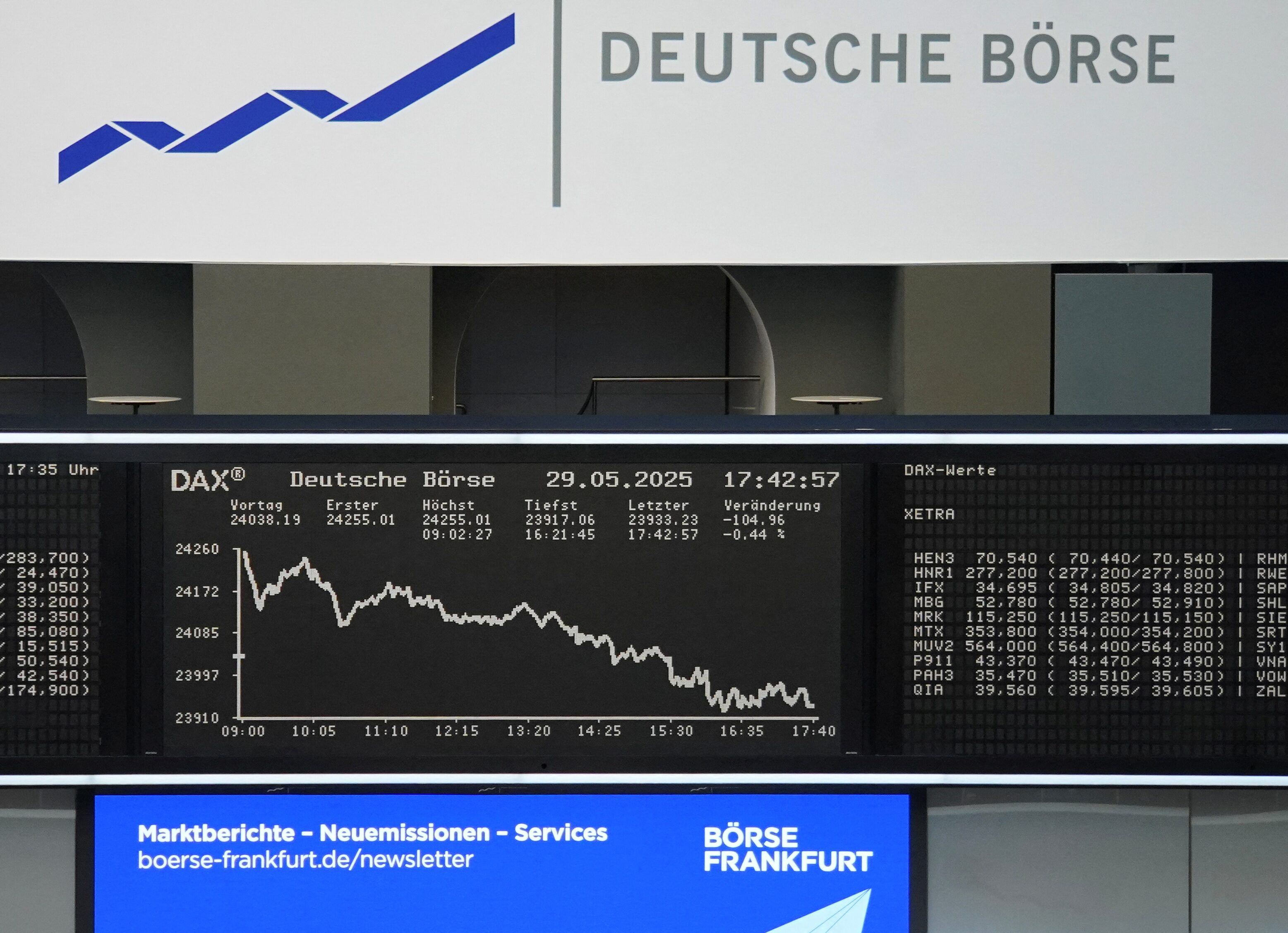 2025年5月29日,德國法蘭克福證券交易所展示的德國DAX股價指數走勢圖。路透社/Wolfgang Rattay路透社5月30日電 - 由於對高債務和債券銷售的擔憂引發的全球政府債券拋售潮也波及了歐元區,但德國日益增長的避險地位應能保護該地區免受長期借貸成本過度上升的影響。