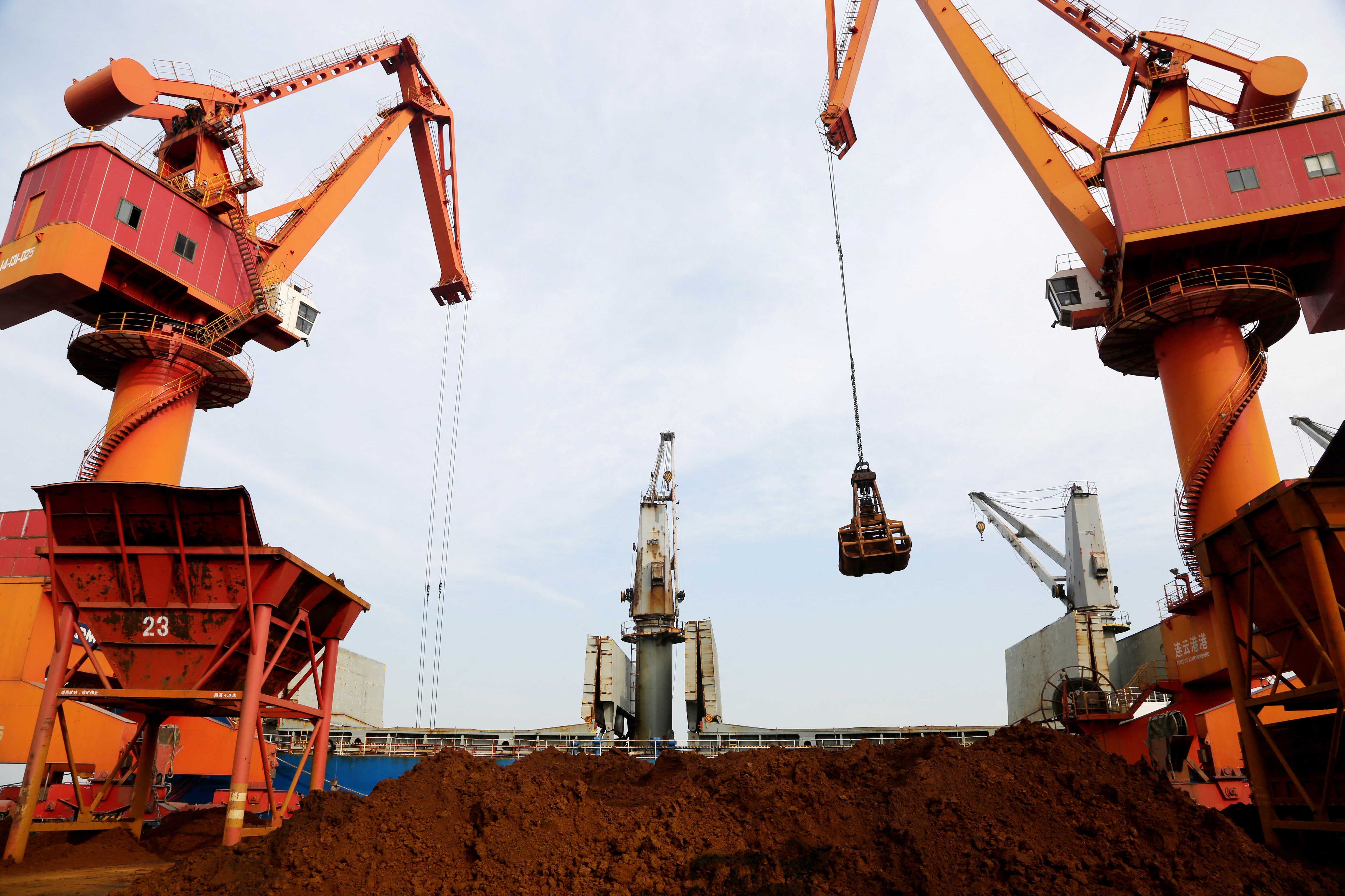 2019年10月27日,中國江蘇省連雲港港口,起重機正在從貨輪上卸下進口鐵礦石。路透社/Stringer 編者注:本圖片由第三方提供。中國境外發布/資料圖新加坡,5月30日(路透社)——分析師和交易商表示,由於今年全球鐵礦石過剩量低於預期,價格前景正在改善,不過幾內亞巨型西芒杜項目即將投產的新供應仍是長期價格下行風險。