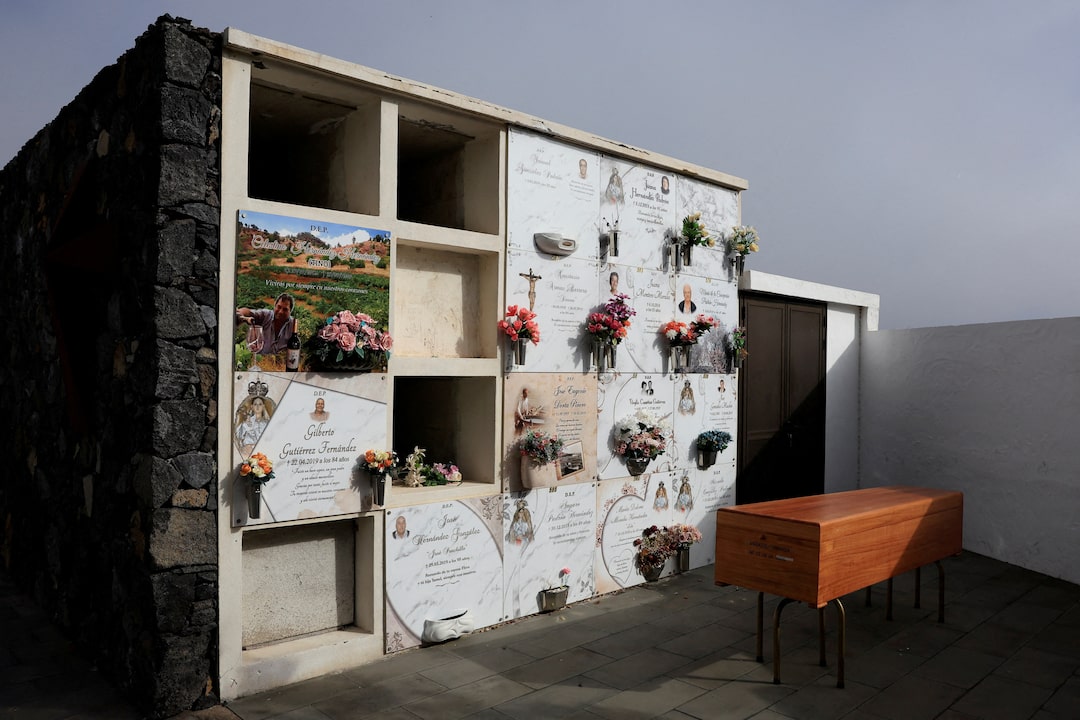 2025年5月30日,西班牙埃爾皮納爾,紅十字會成員在埃爾耶羅島拉雷斯蒂加港附近傾覆的移民船遇難者棺木旁祈禱。路透社/Borja Suarez (路透社馬德里5月31日電)七名在西班牙加那利羣島海岸僅數米處因船隻傾覆遇難的移民婦女兒童,於週五在他們曾期盼獲得安全的拉雷斯特林加港下葬。