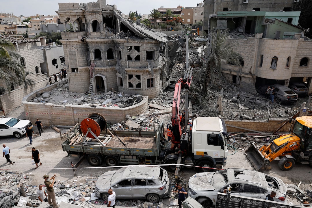 以色列救援隊在被毀住宅樓的廢墟中搜尋,使用手電筒和搜救犬尋找倖存者。當局稱襲擊已造成至少10人死亡,包括兒童。