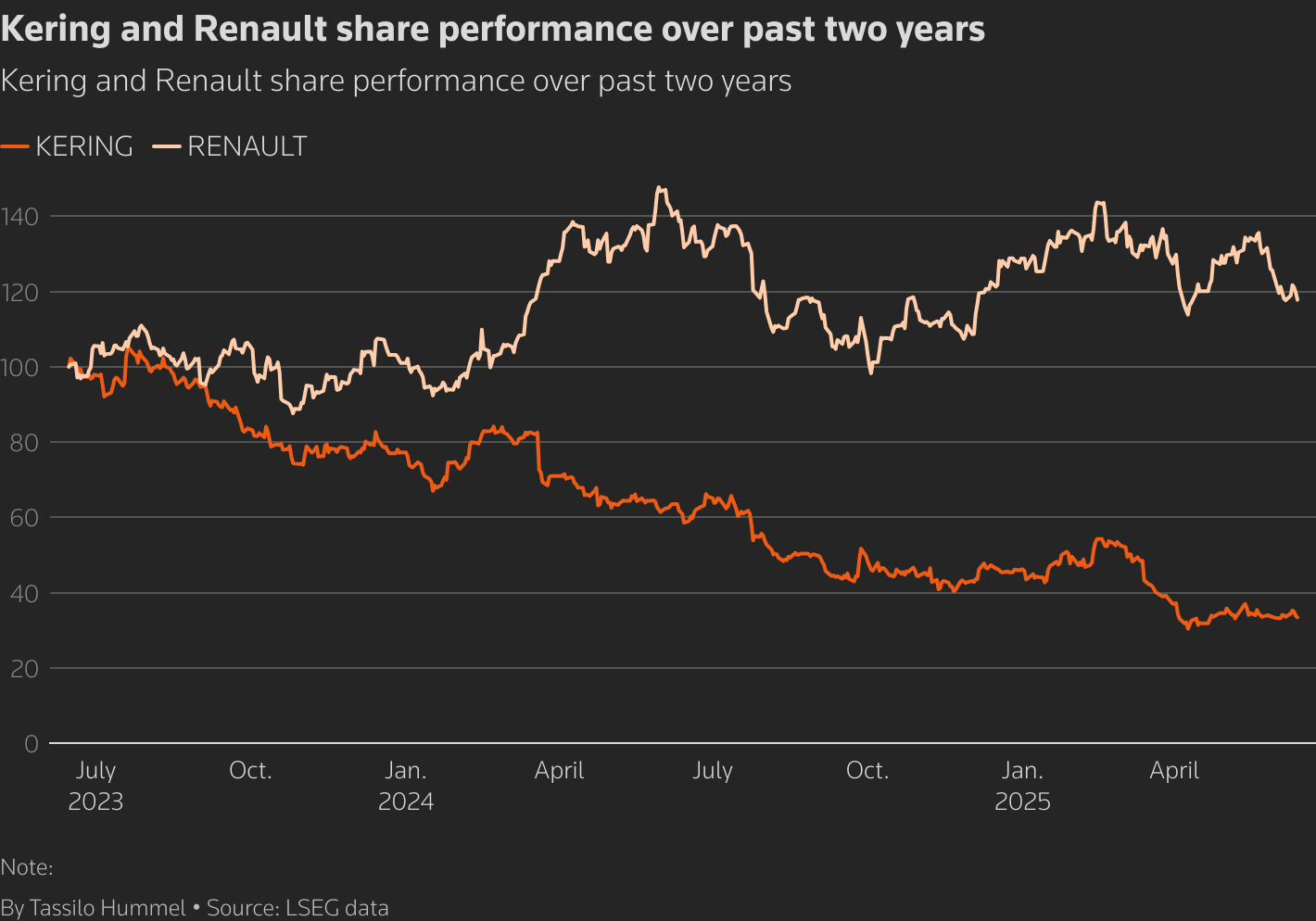 展示開雲集團與雷諾公司自2023年6月以來股價走勢的兩張圖表。
