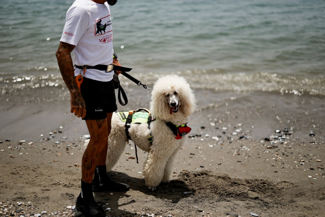 這隻兩歲的標準貴賓犬身披蓬鬆的白色毛髮,胸前繫着救生衣,長鼻子上塗滿防曬霜,顯得與眾不同——西班牙海灘救援隊通常使用拉布拉多犬和紐芬蘭犬。