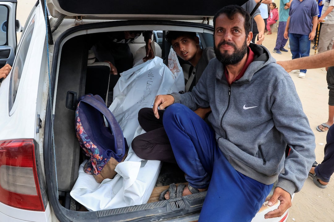 廣告 · 繼續滾動閲讀遇難者親屬抵達納賽爾醫院哀悼。婦女和孩子們在裹着白布的屍體旁哭泣。