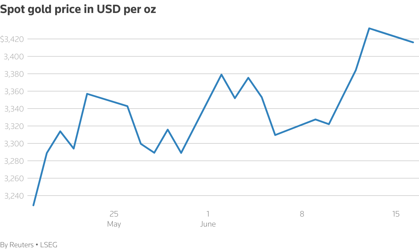 * 截至格林尼治時間10:59,現貨黃金下跌0.4%至每盎司3,419.89美元,此前在早盤交易中觸及4月22日以來的最高水平。美國黃金期貨下跌0.4%至3,439.80美元。