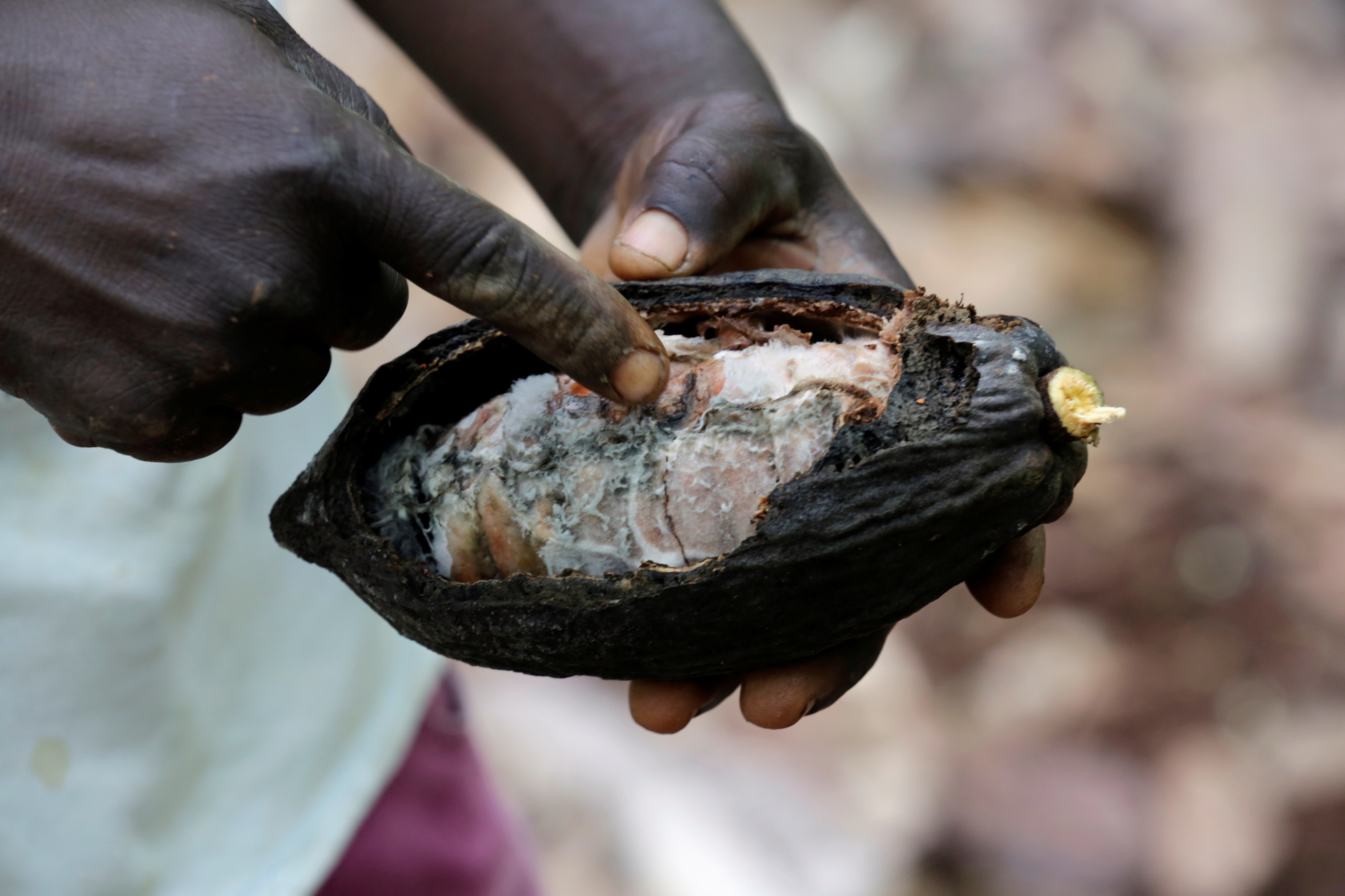 一位農民展示其可可種植園中被腫枝病毀壞的可可豆莢,地點位於科特迪瓦蘇佈雷。路透社/蒂埃裏·古尼翁 購買授權 權利,打開新標籤頁她補充説,作為可可產業核心的該地區強降雨,最終導致巧克力價格幾乎翻倍。