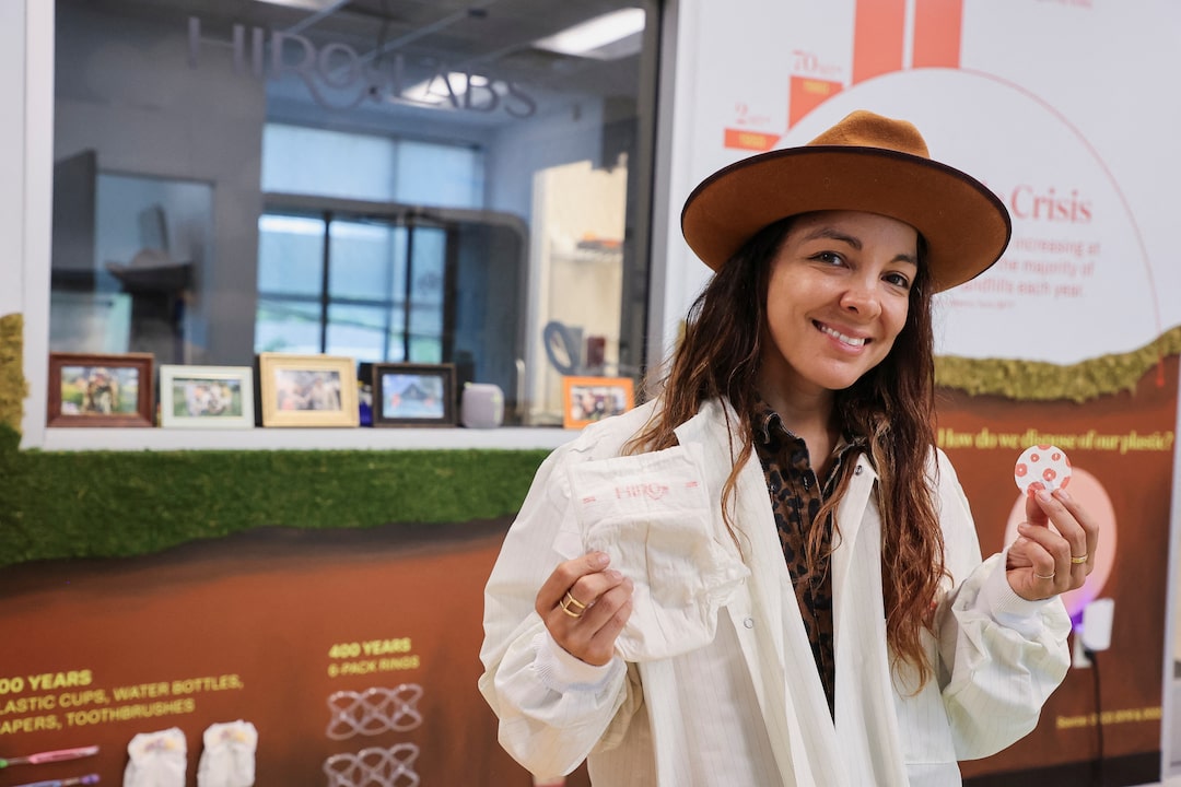 圖1/4:2025年5月15日,美國得克薩斯州奧斯汀市,Hiro科技公司聯合創始人Miki Agrawal在其公司展示一片尿布和一袋食塑真菌。路透社/Evan Garcia
