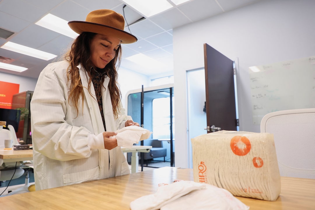 圖1/4:2025年5月15日,美國得克薩斯州奧斯汀市,Hiro科技公司聯合創始人Miki Agrawal在其公司展示一片尿布和一袋食塑真菌。路透社/Evan Garcia
