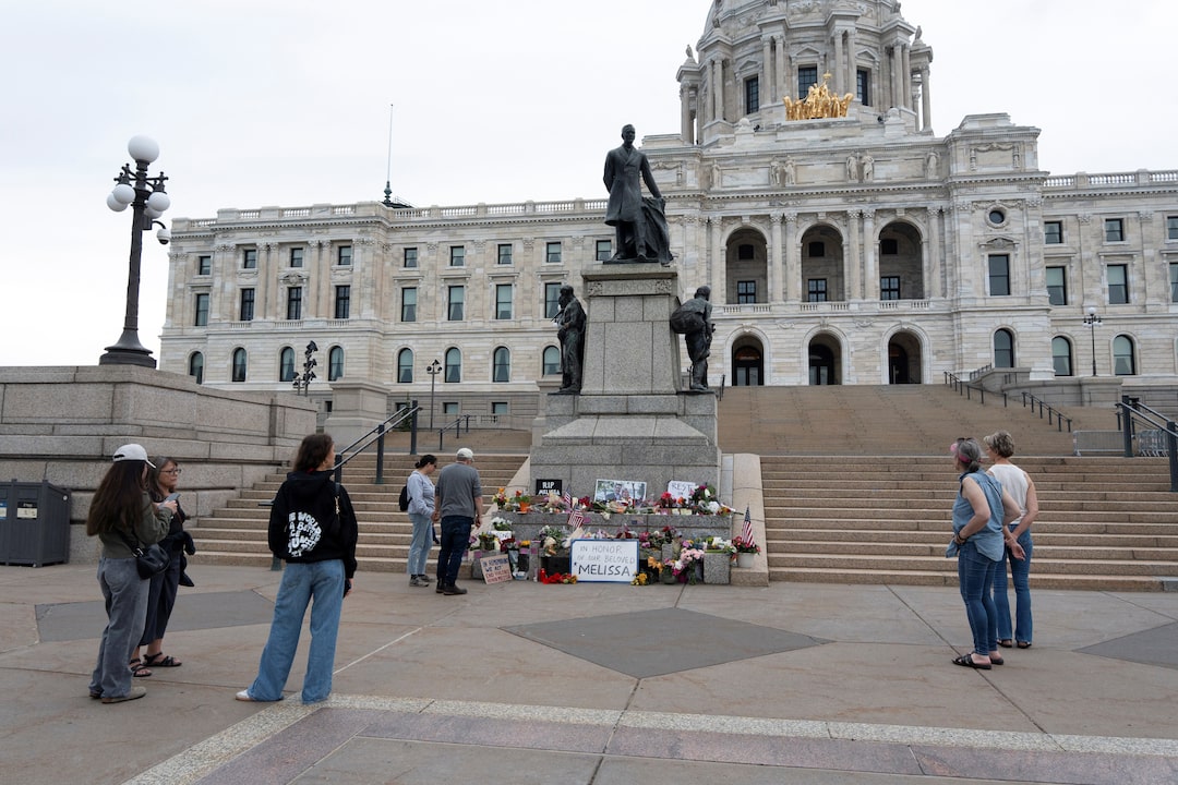 2025年6月15日,美國明尼蘇達州聖保羅市,民眾在明尼蘇達州議會大廈外悼念遭槍殺的民主黨州議員梅麗莎·霍特曼及其丈夫馬克。路透社/蒂姆·埃文斯 購買授權許可,打開新標籤頁6月16日——週六凌晨,明尼蘇達州在短短一個半小時內接連發生慘案:一名民主黨州議員和她的丈夫遭槍殺身亡,另一名民主黨議員及其妻子被偽裝成警察的兇徒嚴重擊傷。