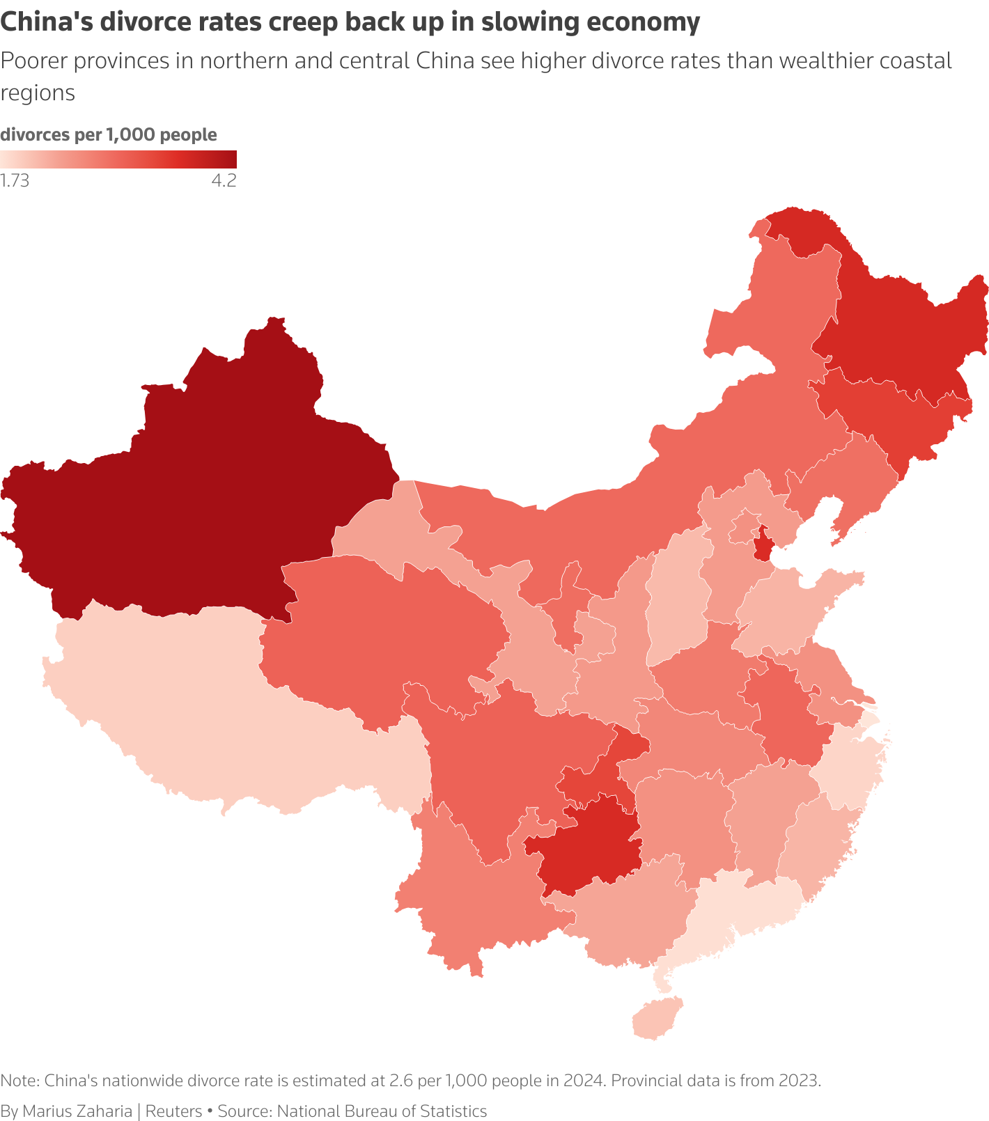 作為離婚率回升由財務壓力驅動的進一步跡象,人口學家指出數據顯示富裕沿海地區的離婚率較低,而較貧窮的內陸和北方地區離婚率較高。